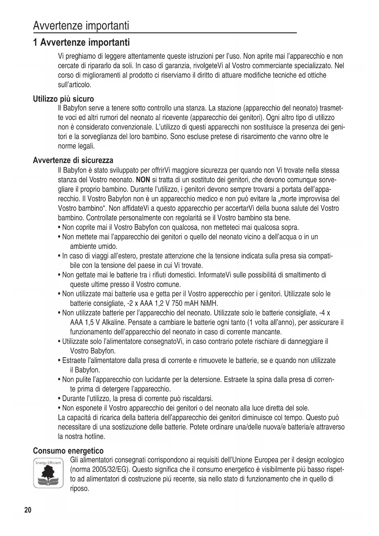 Il Babyfon è stato sviluppato per offrirVi maggiore sicurezza per quando non Vi trovate nella stessa stanza del Vostro neonato. NON si tratta di un sostituto dei genitori, che devono comunque sorvegliare il proprio bambino. Durante l'utilizzo, i genitori devono sempre trovarsi a portata dell'apparecchio. Il Vostro Babyfon non è un apparecchio medico e non può evitare la „morte improvvisa del Vostro bambino“. Non affidateVi a questo apparecchio per accertarVi della buona salute del Vostro bambino. Controllate personalmente con regolarità se il Vostro bambino sta bene.