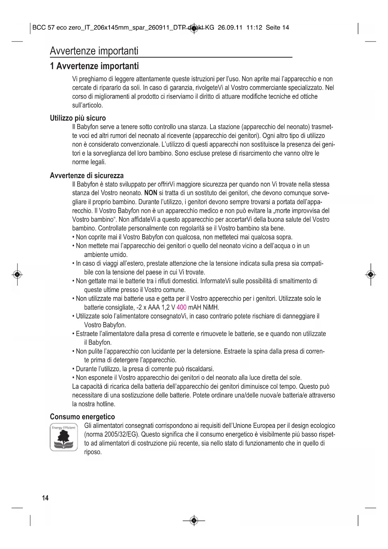 - Non utilizzato mai batterie usa e getta per il Vostro apperecchio per i genitori. Utilizzate solo le batterie consigliate, -2 x AAA 1,2 V 400 mAH NiMH.
