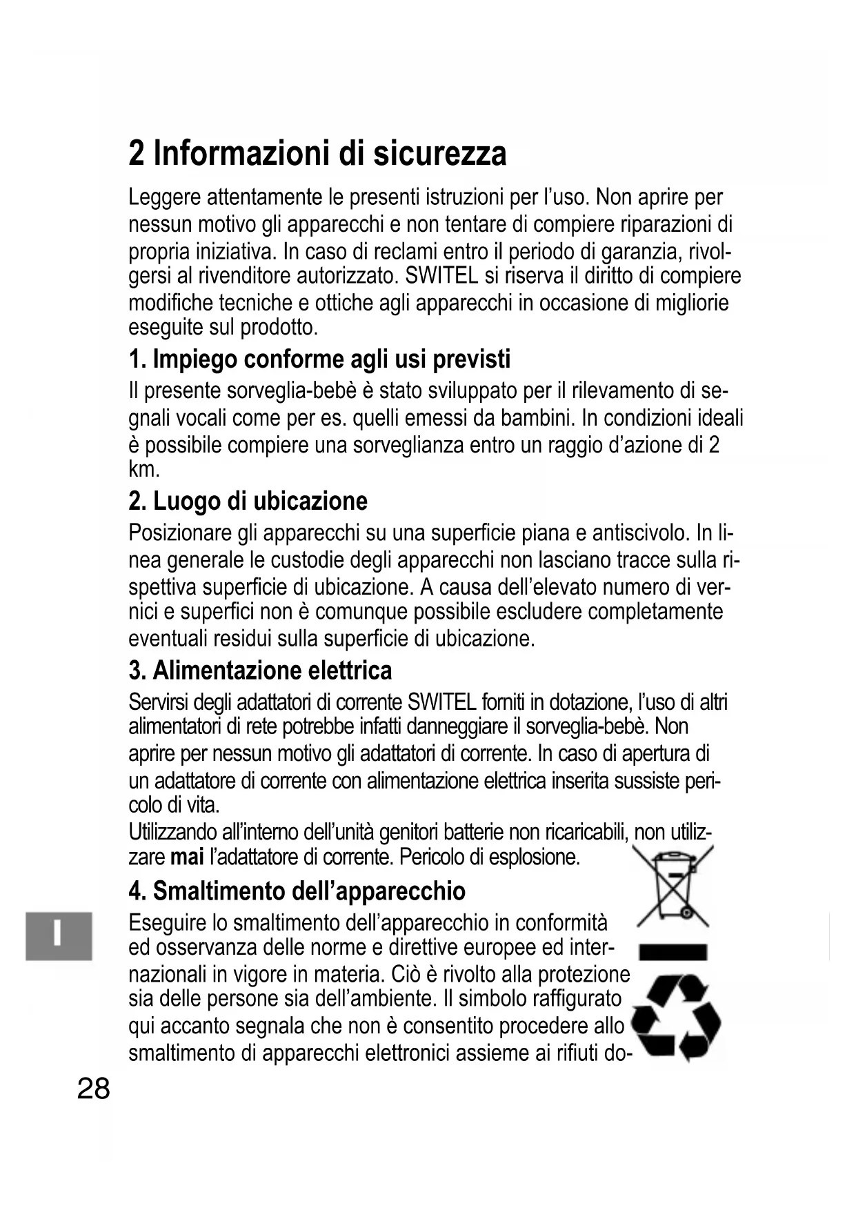 Servirsi degli adattatori di corrente SWITEL forniti in dotazione, l'uso di altri alimentatori di rete potrebbe infatti danneggiare il sorveglia-bebè. Non aprire per nessun motivo gli adattatori di corrente. In caso di apertura di un adattatore di corrente con alimentazione elettrica inserita sussiste pericolo di vita.