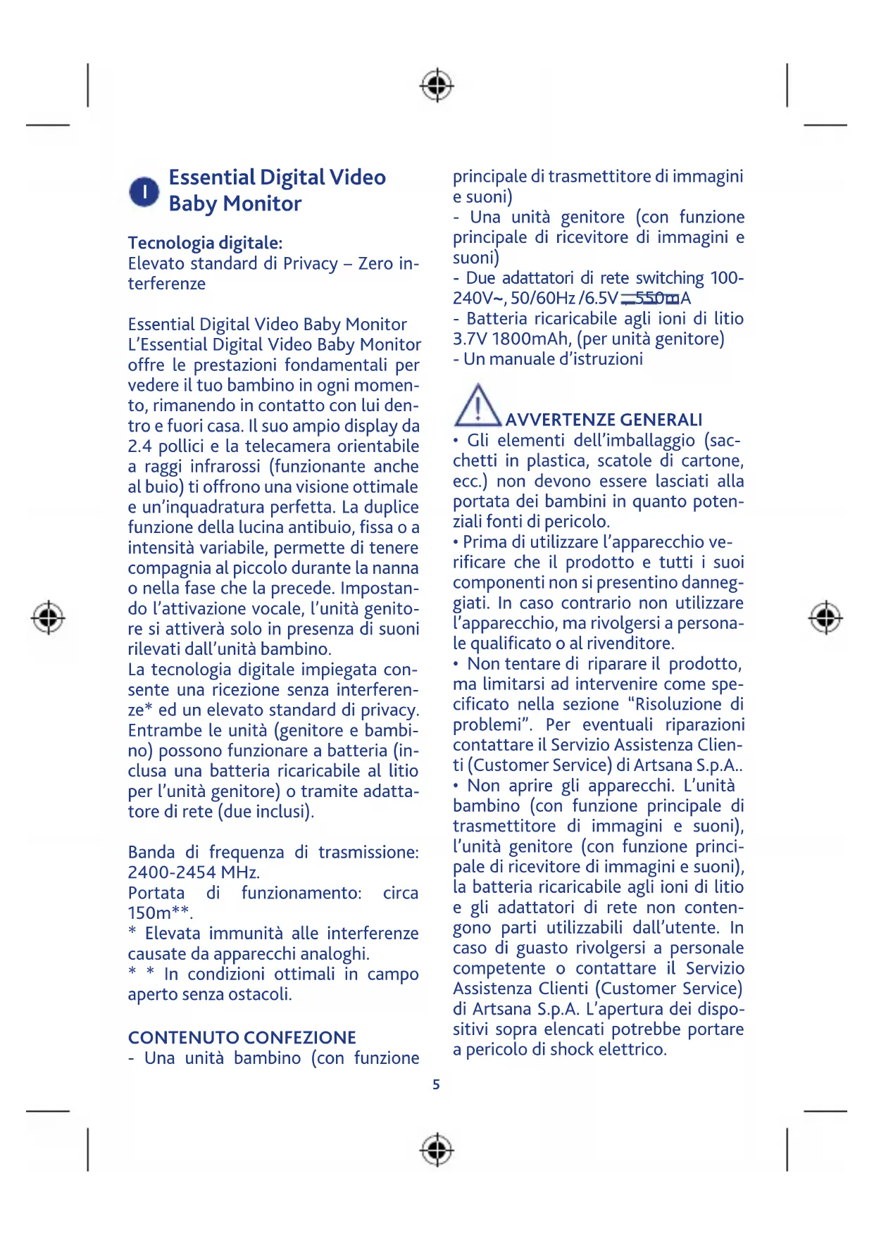- Non aprire gli apparecchi. L’unità bambino (con funzione principale di trasmettitore di immagini e suoni), l’unità genitore (con funzione princi- pale di ricevitore di immagini e suoni), la batteria ricaricabile agli ioni di litio e gli adattatori di rete non conten- gono parti utilizzabili dall’utente. In caso di guasto rivolgersi a personale competente o contattare il Servizio Assistenza Clienti (Customer Service) di Artsana S.p.A. L’apertura dei dispo- sitivi sopra elencati potrebbe portare a pericolo di shock elettrico.