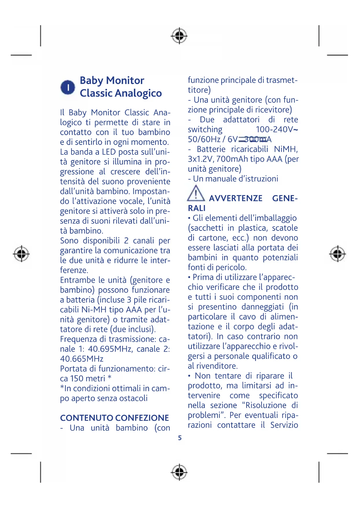 Baby Monitor Classic Analogico Il Baby Monitor Classic Ana- logico ti permette di stare in contatto con il tuo bambino e di sentirlo in ogni momento. La banda a LED posta sull’uni- tà genitore si illumina in pro- gressione al crescere dell’in- tensità del suono proveniente dall’unità bambino. Impostan- do l’attivazione vocale, l’unità genitore si attiverà solo in pre- senza di suoni rilevati dall’uni- tà bambino. Sono disponibili 2 canali per garantire la comunicazione tra le due unità e ridurre le inter- ferenze. Entrambe le unità (genitore e bambino) possono funzionare a batteria (incluse 3 pile ricari- cabili Ni-MH tipo AAA per l’u- nità genitore) o tramite adat- tatore di rete (due inclusi). Frequenza di trasmissione: ca- nale 1: 40.695MHz, canale 2: 40.665MHz Portata di funzionamento: cir- ca 150 metri * *In condizioni ottimali in cam- po aperto senza ostacoli CONTENUTO CONFEZIONE - Una unità bambino (con funzione principale di trasmet- titore) - Una unità genitore (con fun- zione principale di ricevitore) - Due adattatori di rete switching 100-240V~ 50/60Hz / 6V 300mA - Batterie ricaricabili NiMH, 3x1.2V, 700mAh tipo AAA (per unità genitore) - Un manuale d’istruzioni AVVERTENZE GENE- RALI