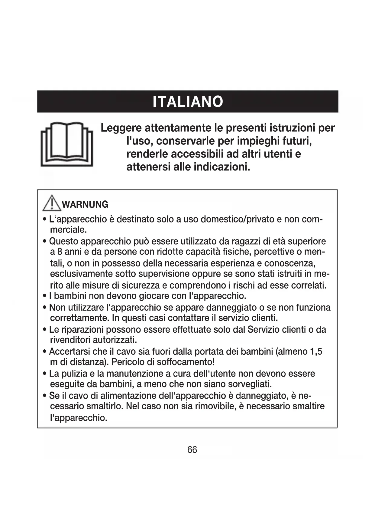 TALIANO Leggere attentamente le presenti istruzioni per l'uso, conservarle per impieghi futuri, renderle accessibili ad altri utenti e attenersi alle indicazioni. WARNUNG