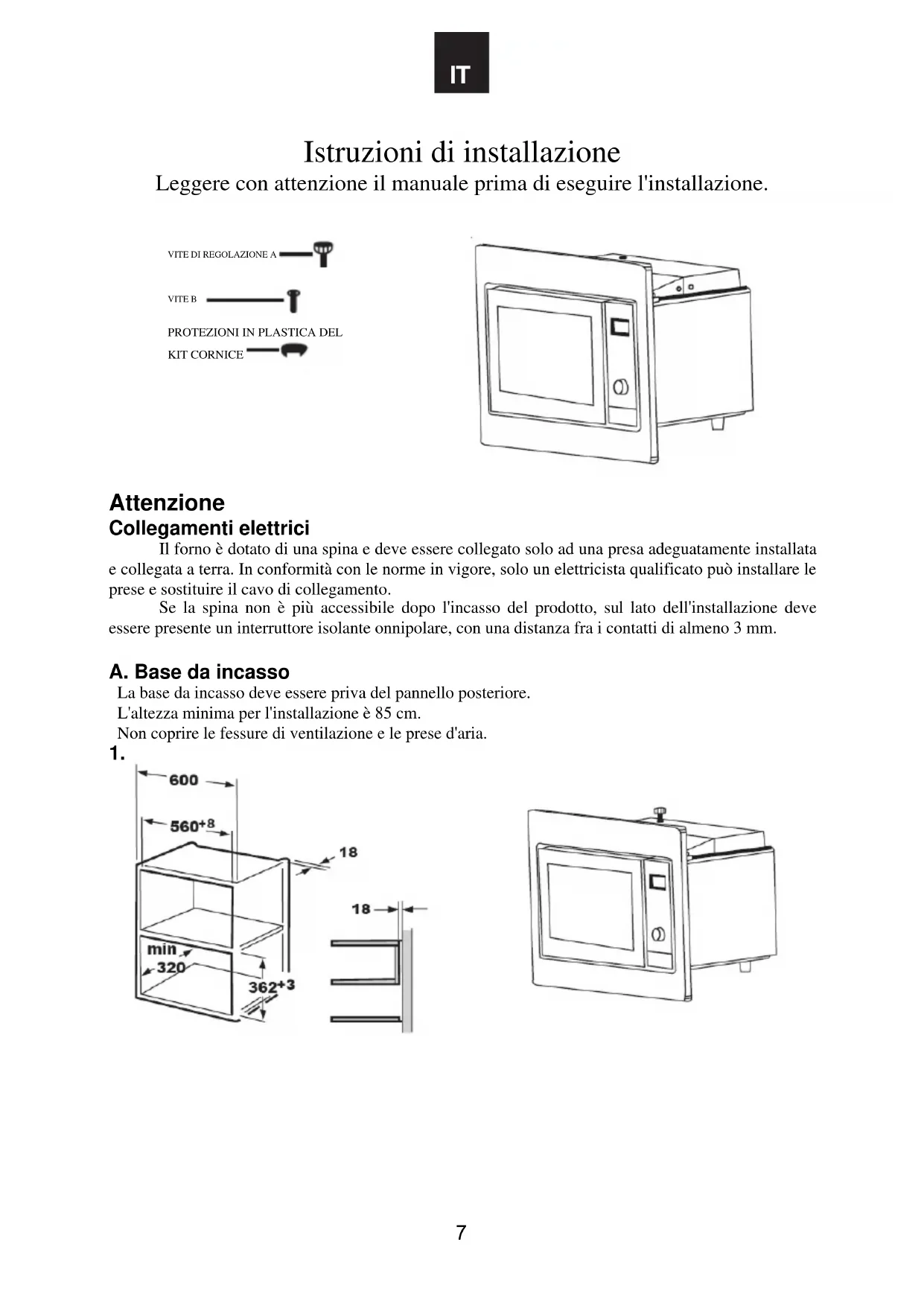 Attenzione Collegamenti elettrici Il forno è dotato di una spina e deve essere collegato solo ad una presa adeguatamente installata e collegata a terra. In conformità con le norme in vigore, solo un elettricista qualificato può installare le prese e sostituire il cavo di collegamento. Se la spina non è più accessibile dopo l'incasso del prodotto, sul lato dell'installazione deve essere presente un interruttore isolante onnipolare, con una distanza fra i contatti di almeno 3 mm. A. Base da incasso La base da incasso deve essere priva del pannello posteriore. L'altezza minima per l'installazione è 85 cm. Non coprire le fessure di ventilazione e le prese d'aria.
