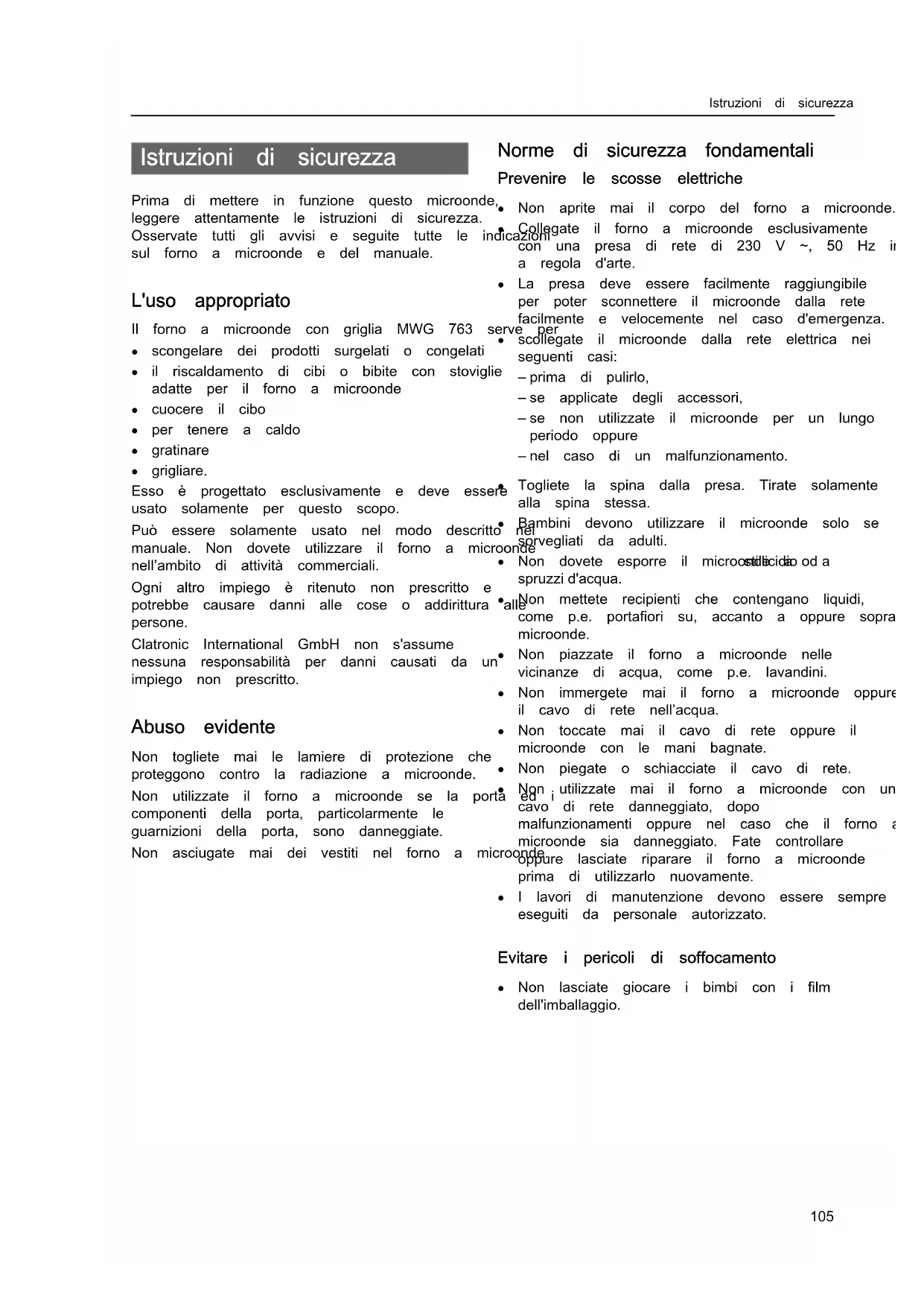 grigliare. Esso è progettato esclusivamente e deve essere usato solamente per questo scopo. Può essere solamente usato nel modo descritto nel manuale. Non dovete utilizzare il forno a microonde nell’ambito di attività commerciali. Ogni altro impiego è ritenuto non prescritto e potrebbe causare danni alle cose o addirittura alle persone. Clatronic International GmbH non s'assume nessuna responsabilità per danni causati da un impiego non prescritto. Abuso evidente Non togliete mai le lamiere di protezione che proteggono contro la radiazione a microonde. Non utilizzate il forno a microonde se la porta ed i componenti della porta, particolarmente le guarnizioni della porta, sono danneggiate. Non asciugate mai dei vestiti nel forno a microonde. Norme di sicurezza fondamentali Prevenire le scosse elettriche