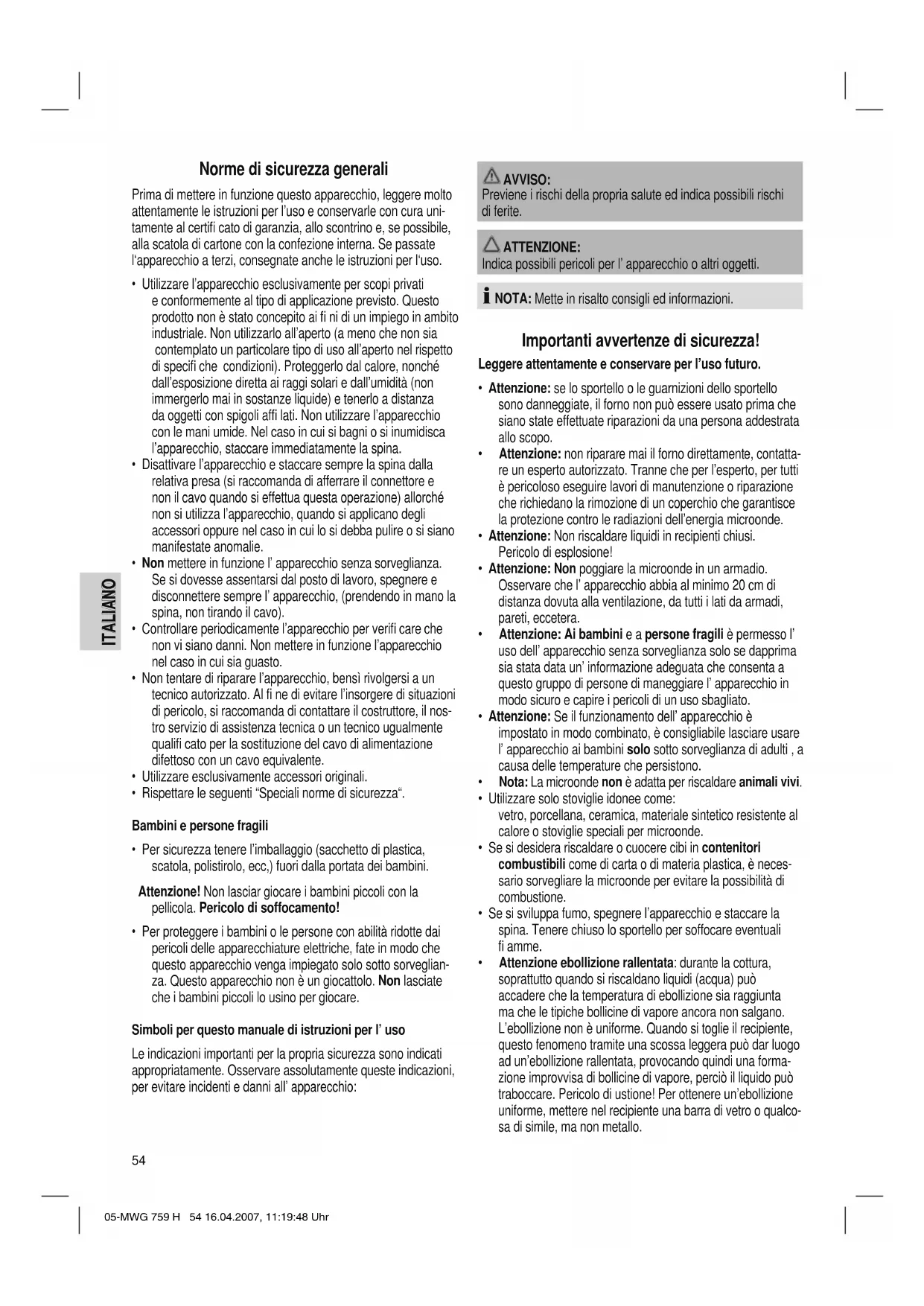 - Riscaldare solo 1-2 porzioni alla volta, altrimenti l’apparecchio perde la sua effi cacia. 05-MWG 759 H 55 16.04.2007, 11:19:50 Uhr56 ITALIANO ITALIANO