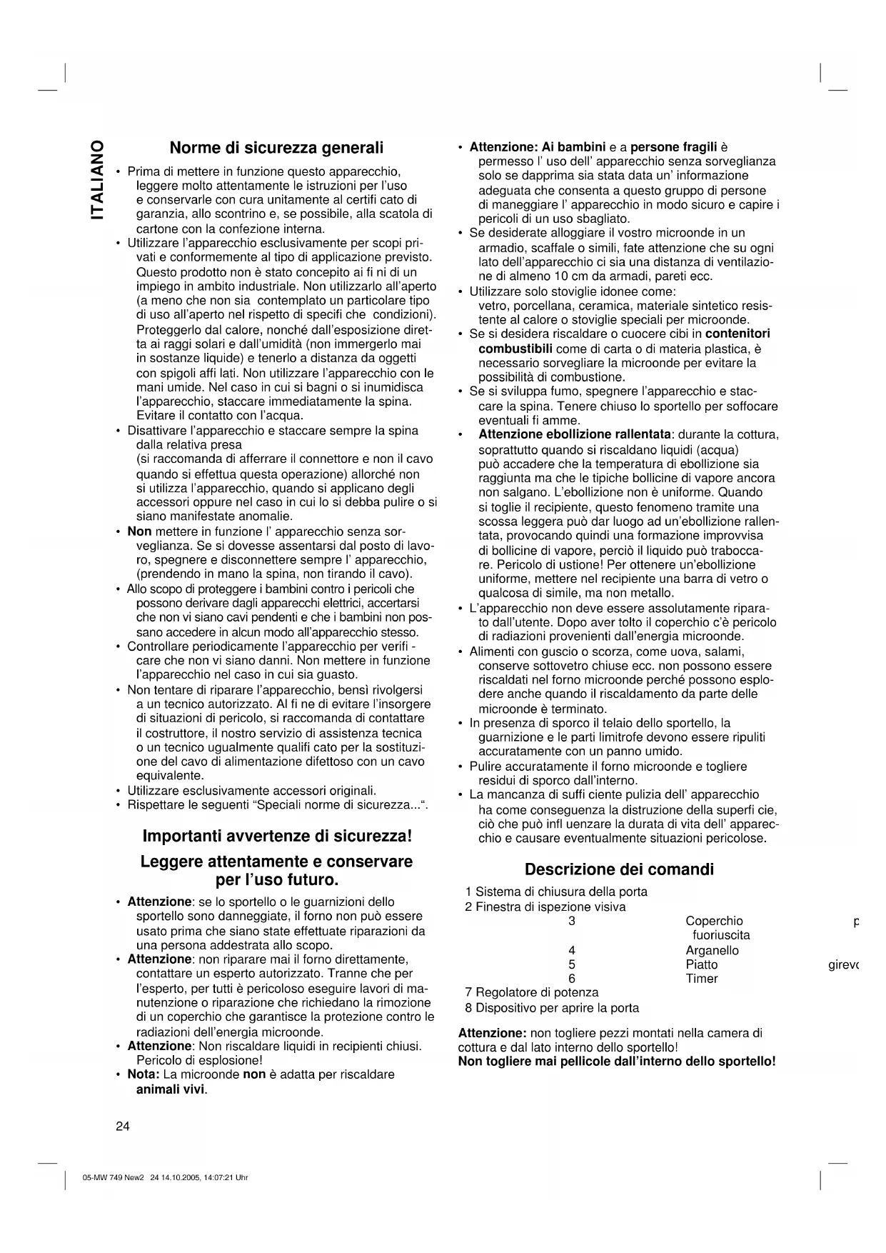 - La mancanza di suffi ciente pulizia dell’ apparecchio ha come conseguenza la distruzione della superfi cie, ciò che può infl uenzare la durata di vita dell’ apparec- chio e causare eventualmente situazioni pericolose. Descrizione dei comandi 1 Sistema di chiusura della porta 2 Finestra di ispezione visiva 3 Coperchio per fuoriuscita microonde 4 Arganello 5 Piatto girevole 6 Timer 7 Regolatore di potenza 8 Dispositivo per aprire la porta Attenzione: non togliere pezzi montati nella camera di cottura e dal lato interno dello sportello! Non togliere mai pellicole dall’interno dello sportello! 05-MW 749 New2 24 14.10.2005, 14:07:21 Uhr25 ITALIANO Messa in funzione