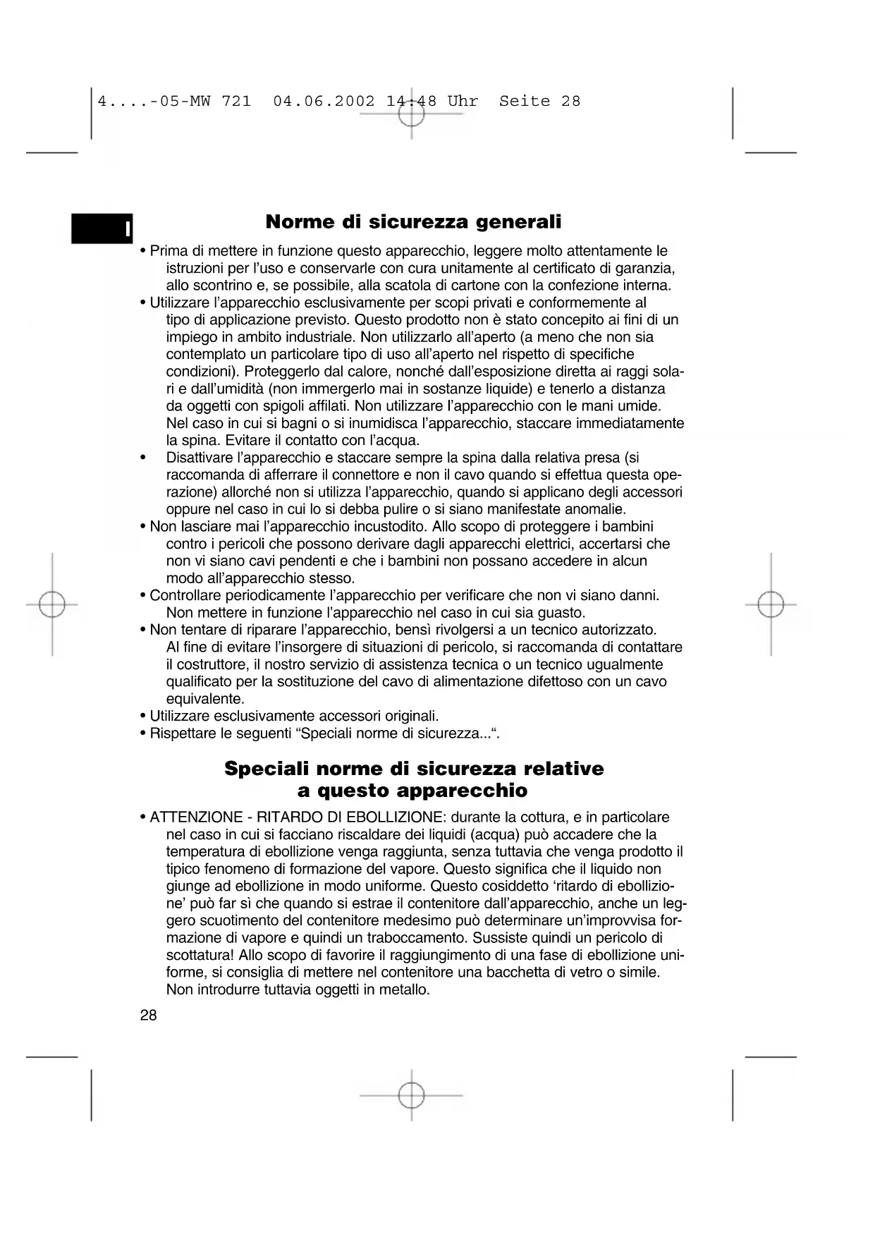 4....-05-MW 721 04.06.2002 14:48 Uhr Seite 28• Si raccomanda di non far scaldare i liquidi in contenitori con coperchio. Sussiste infatti il pericolo di esplosione!