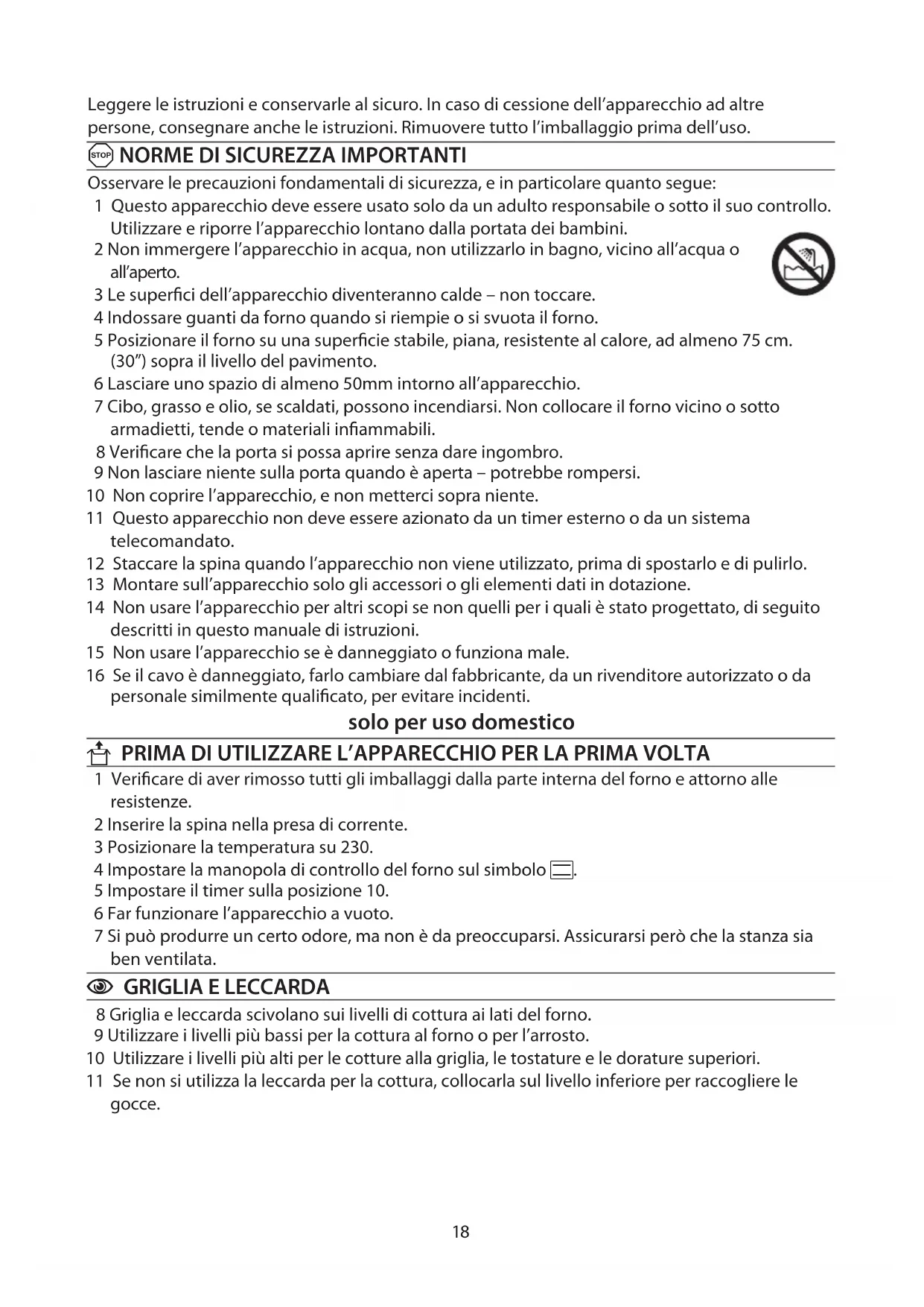 Osservare le precauzioni fondamentali di sicurezza, e in particolare quanto segue: 1 Questo apparecchio deve essere usato solo da un adulto responsabile o sotto il suo controllo. Utilizzare e riporre l’apparecchio lontano dalla portata dei bambini. 2 Non immergere l’apparecchio in acqua, non utilizzarlo in bagno, vicino all’acqua o all’aperto. 3 Le superfici dell’apparecchio diventeranno calde – non toccare. 4 Indossare guanti da forno quando si riempie o si svuota il forno. 5 Posizionare il forno su una superficie stabile, piana, resistente al calore, ad almeno 75 cm. (30”) sopra il livello del pavimento. 6 Lasciare uno spazio di almeno 50mm intorno all’apparecchio. 7 Cibo, grasso e olio, se scaldati, possono incendiarsi. Non collocare il forno vicino o sotto armadietti, tende o materiali infiammabili. 8 Verificare che la porta si possa aprire senza dare ingombro. 9 Non lasciare niente sulla porta quando è aperta – potrebbe rompersi. 10 Non coprire l’apparecchio, e non metterci sopra niente. 11 Questo apparecchio non deve essere azionato da un timer esterno o da un sistema telecomandato. 12 Staccare la spina quando l’apparecchio non viene utilizzato, prima di spostarlo e di pulirlo. 13 Montare sull’apparecchio solo gli accessori o gli elementi dati in dotazione. 14 Non usare l’apparecchio per altri scopi se non quelli per i quali è stato progettato, di seguito descritti in questo manuale di istruzioni. 15 Non usare l’apparecchio se è danneggiato o funziona male. 16 Se il cavo è danneggiato, farlo cambiare dal fabbricante, da un rivenditore autorizzato o da personale similmente qualificato, per evitare incidenti. solo per uso domestico U PRIMA DI UTILIZZARE L’APPARECCHIO PER LA PRIMA VOLTA 1 Verificare di aver rimosso tutti gli imballaggi dalla parte interna del forno e attorno alle resistenze. 2 Inserire la spina nella presa di corrente. 3 Posizionare la temperatura su 230. 4 Impostare la manopola di controllo del forno sul simbolo H. 5 Impostare il timer sulla posizione 10. 6 Far funzionare l’apparecchio a vuoto. 7 Si può produrre un certo odore, ma non è da preoccuparsi. Assicurarsi però che la stanza sia ben ventilata.