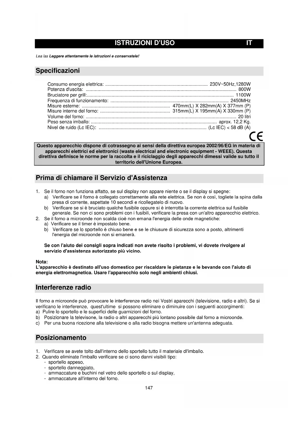 collocamento del forno. ATTENZIONE: Il forno possiede la propria protezione e cioè il fusibile 250V, 10A. IMPORTANTE I colori dei fili elettrici hanno il seguente significato: Verde-gialla: filo di messa a terra Blu: filo neutrale Marrone: filo di fase Poichè i colori dei fili elettrici potrebbero non corrispondere ai segni colorati nel terminale della spina, seguite il seguente: - Il filo verde-giallo va collegato nel terminale della spina che è segnato con la lettera E o il simbolo per la messa a terra. - Il filo blu va collegato nel terminale della spina che è segnato con la lettera N. - Il filo marrone va collegato nel terminale della spina che è segnato con la lettera L. Importanti istruzioni di sicurezza AVVERTENZA: quando l'apparecchio viene usato nel modo combinato si sprigionano le temperature molto alte (solo gli apparecchi con la funzione del grill). L'uso da parte dei bambini va sorvegliato dagli adulti. AVVERTENZA : Se la guarnizione dello sportello è danneggiato, l'uso dell'aparecchio è vietato finchè non riparato da un tecnico autorizzato. AVVERTENZA: La riparazione d'apparecchio può essere eseguito solo da un tecnico autorizzato. AVVERTENZA: non riscaldare liquidi o altre pietanze nei recipienti troppo piccoli poichè possono esplodere. AVVERTENZA: L'apparecchio non può essere usato da parte dei bambini e dalle persone con le diminuite capacità fisiche o mentali ed anche da parte delle persone con le scarse conoscenze e esperienze tranne se sono sorvegliate da una persona esperta che gli consiglia e si rende responsabile per la loro sicurezza. Bambini non devono giocare con l'apparecchio. Per assicurare l'aerazione a sufficienza bisogna lasciare uno spazio di almeno 8 cm, ai lati del forno di almeno 10 cm e sopra il forno di almeno 10 cm. Non eliminare i piedini dal forno e non coprire le aperture di aerazione. Usare gli accessori adatti per l'uso nel microonde. Quando scaldate il cibo nei recipienti di plastica o di carta; quest'ultimi vanno sorvegliati durante il processo di riscaldamento per il pericolo di incendio del recipiente. Se notate il fumo, spegnete l'apparecchio e staccatelo dalla rete elettrica, mentre lo sportello lasciate chiuso per soffocare possibile incendio all'interno. Quando scaldate le bevande nel microonde, queste si scaldano molto velocemente e possono bollire e fuoriuscire dal recipiente. Fate molta attenzione. Per evitare le ustioni, prima dell'uso mischiare il contenuto e scuotere il biberon di latte per i neonati. Verificare sempre la temperatura del cibo o del liquido. Nel microonde non si devono scaldare le uova con la buccia o le uova sode poichè possono esplodere dopo che il riscaldamento nel microonde è terminato. Quando pulite gli interni del forno e le guarnizioni, dovete usare i detersivi delicati (non abrasivi) e una spugna morbida. Pulire regolarmente il forno dai residui di cibo.149 In quanto non provedete alla regolare manutenzione e pulizia del forno, questo può provocare il deterioramento delle superfici, la diminuzione della lunghezza di vita d'apparecchio e aumento di rischi durante il suo uso. Se il cavo di collegamento è danneggiato bisogna essere sostituito dal produttore o da un tecnico autorizzato. Le istruzioni di sicurezza per un'uso generale In seguito troverete alcune regole e norme di sicurezza che, come con gli altri apparecchi, bisogna rispettare per assicurarsi un'uso sicuro e un funzionamento ottimale del forno: