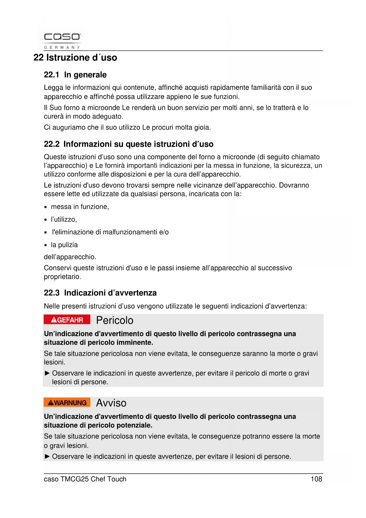 Nelle presenti istruzioni d’uso vengono utilizzate le seguenti indicazioni d’avvertenza: Pericolo Un’indicazione d'avvertimento di questo livello di pericolo contrassegna una situazione di pericolo imminente. Se tale situazione pericolosa non viene evitata, le conseguenze saranno la morte o gravi lesioni. ► Osservare le indicazioni in queste avvertenze, per evitare il pericolo di morte o gravi lesioni di persone. Avviso Un’indicazione d'avvertimento di questo livello di pericolo contrassegna una situazione di pericolo potenziale. Se tale situazione pericolosa non viene evitata, le conseguenze potranno essere la morte o gravi lesioni. ► Osservare le indicazioni in queste avvertenze, per evitare il lesioni di persone.caso TMCG25 Chef Touch 109