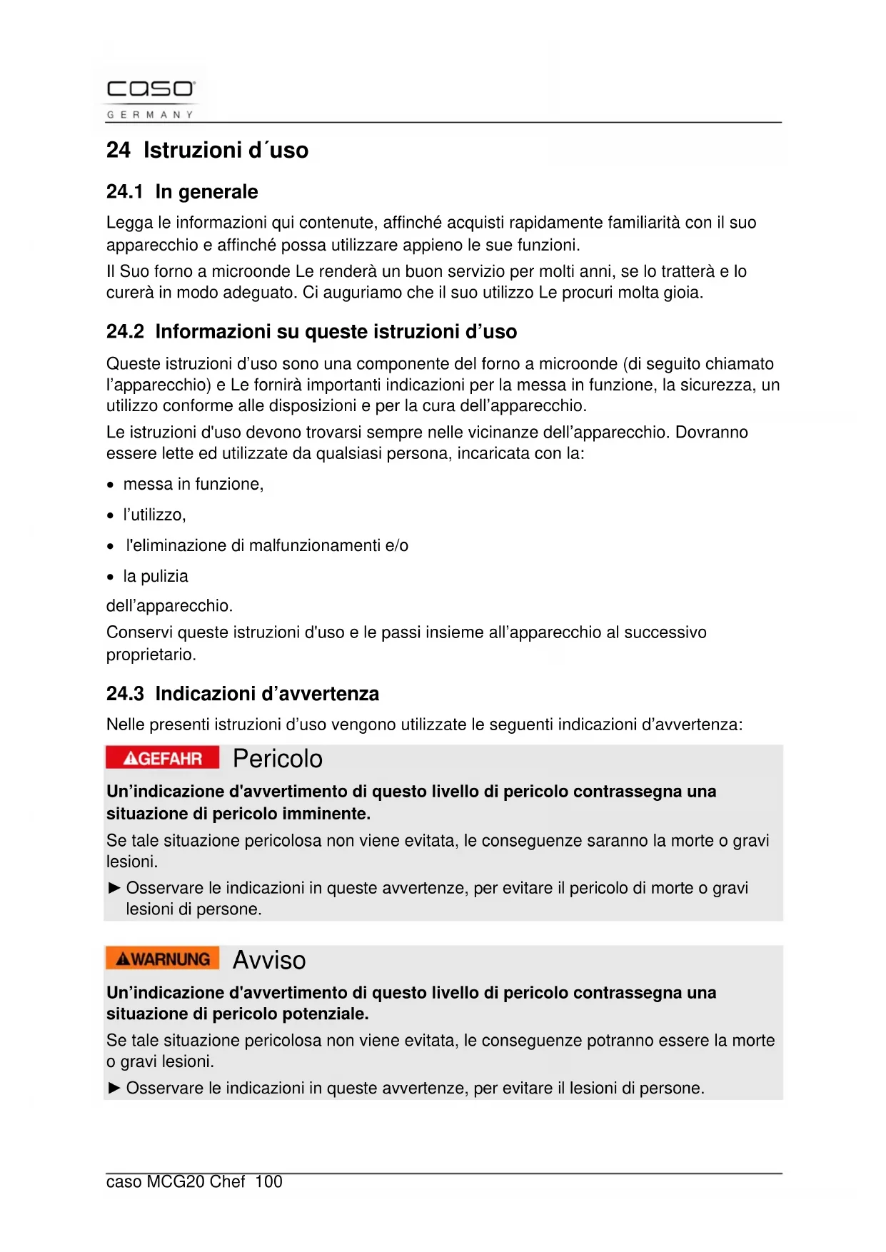 Questo documento è coperto dalla tutela per i diritti d’autore. La caso Deutschland Braukmann GmbH si riserva tutti i diritti, anche quelli della riproduzione fotomeccanica, della riproduzione e diffusione mediante particolari procedure (per esempio mediante l'elaborazione dati, supporto dati e reti di dati) anche parziale. Ci si riserva il diritto di effettuare modifiche tecniche e nel contenuto. 25 Sicurezza In questo capitolo riceverà importanti indicazioni sulla sicurezza nell’utilizzo dell’apparecchio. Questo apparecchio corrisponde alle disposizioni di sicurezza prescritte. Un utilizzo inadeguato può però provocare danni a persone e cose.caso MCG20 Chef 102