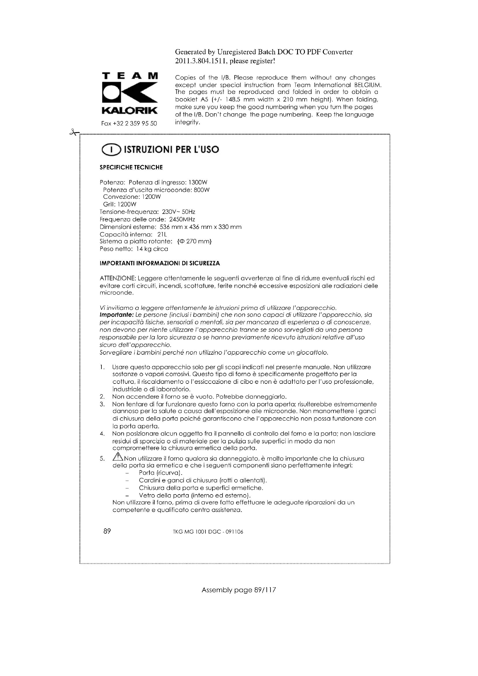 ricambio. DIRETTIVA 2002/96/CE PER LO SMALTIMENTO DELLE APPARECCHIATURE ELETTRICHE ED ELETTRONICHE Per preservare l'ambiente e la nostra salute, l'eliminazione dei vecchi apparecchi elettrici e elettronici non più utilizzati, va fatta secondo la direttiva sopra citata che impone l'obbligo al costruttore, al commerciante e a l'utilizzatore di consegnare gli apparecchi ai centri di raccolta specializzati, i quali saranno in grado di smaltire e riciclare i vecchi prodotti come la legge prescrive. Per questa ragione troverete apposto sulla etichetta segnaletica il simbolo che indica di non gettare il vecchio apparecchio non più utilizzato, in pattumiera o nel cassonetto delle immondizie. Per eliminare il vecchio apparecchio non più utilizzato, potete consegnarlo al rivenditore il cambio di quello nuovo acquistato, o direttamente nei centri di raccolta specializzati messi a disposizione dal vostro comune di residenza.Generated by Unregistered Batch DOC TO PDF Converter 2011.3.804.1511, please register! Copies of the I/B. Please reproduce them without any changes except under special instruction from Team International BELGIUM. The pages must be reproduced and folded in order to obtain a booklet A5 (+/- 148.5 mm width x 210 mm height). When folding, make sure you keep the good numbering when you turn the pages of the I/B. Don‟t change the page numbering. Keep the language integrity.