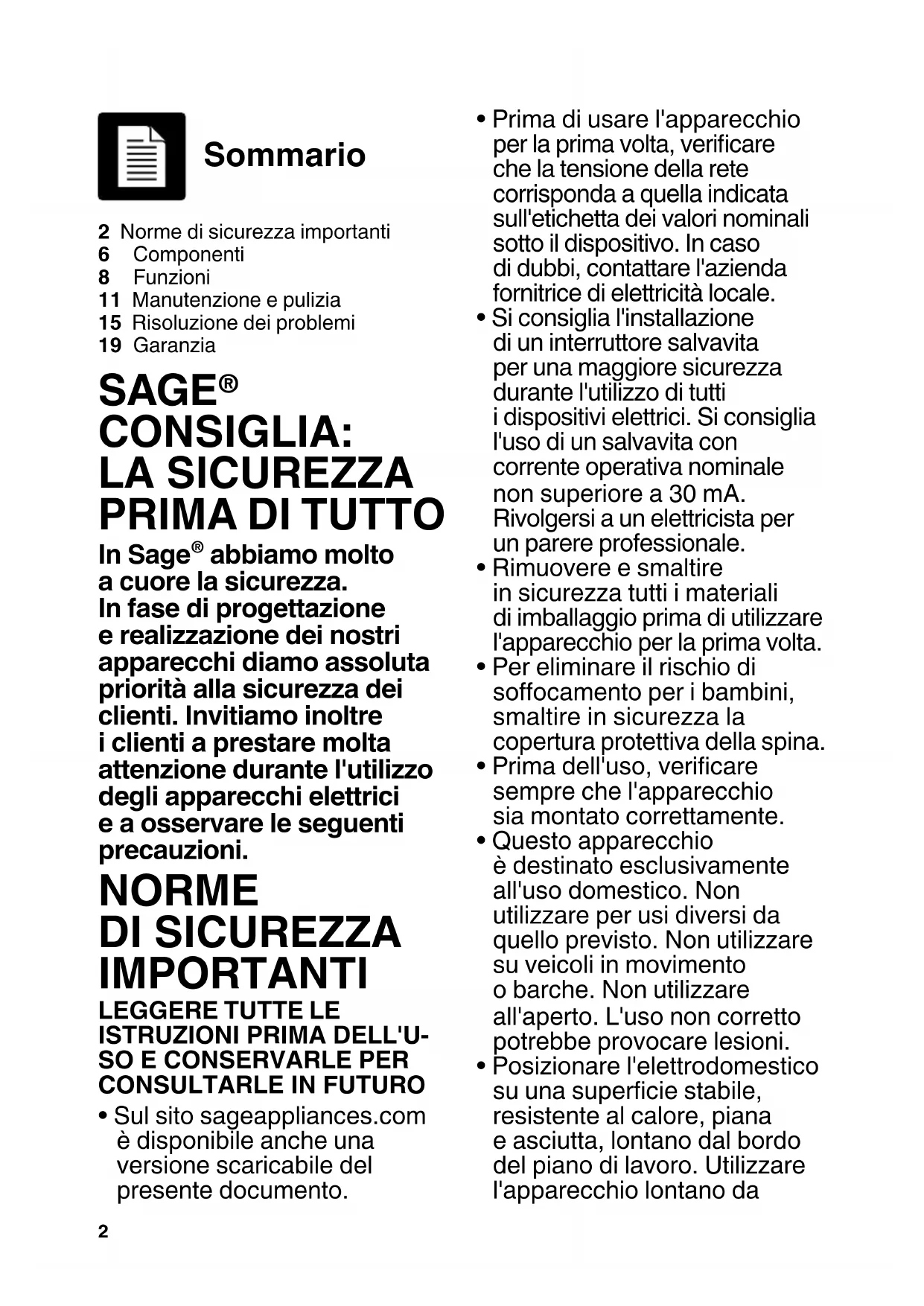 - Sul sito sageappliances.com è disponibile anche una versione scaricabile del presente documento.