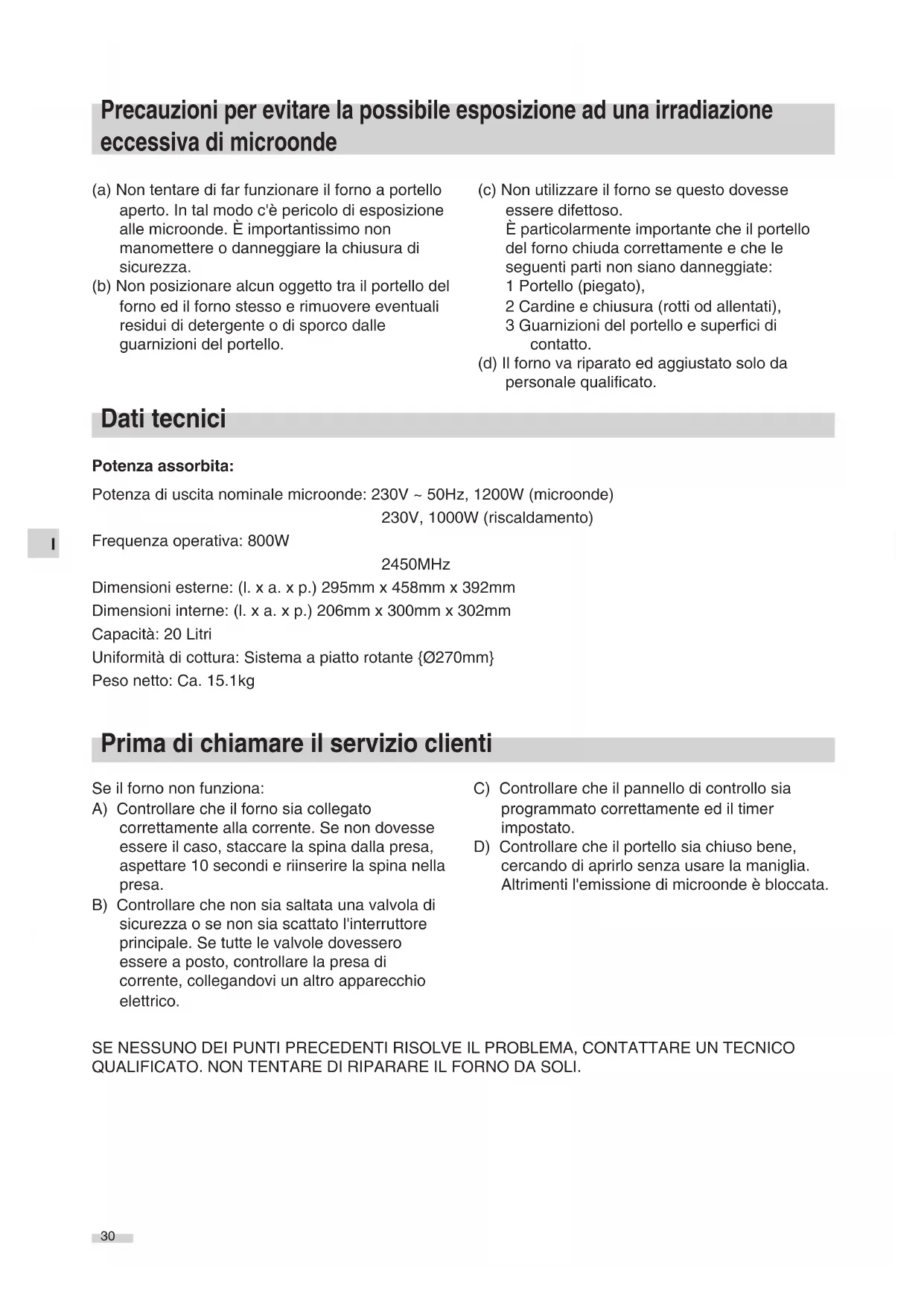 (a) Non tentare di far funzionare il forno a portello aperto. In tal modo c'è pericolo di esposizione alle microonde. È importantissimo non manomettere o danneggiare la chiusura di sicurezza. (b) Non posizionare alcun oggetto tra il portello del forno ed il forno stesso e rimuovere eventuali residui di detergente o di sporco dalle guarnizioni del portello. (c) Non utilizzare il forno se questo dovesse essere difettoso. È particolarmente importante che il portello del forno chiuda correttamente e che le seguenti parti non siano danneggiate: 1 Portello (piegato), 2 Cardine e chiusura (rotti od allentati), 3 Guarnizioni del portello e superfici di contatto. (d) Il forno va riparato ed aggiustato solo da personale qualificato. Potenza assorbita: Potenza di uscita nominale microonde: 230V ~ 50Hz, 1200W (microonde) 230V, 1000W (riscaldamento) Frequenza operativa: 800W 2450MHz Dimensioni esterne: (l. x a. x p.) 295mm x 458mm x 392mm Dimensioni interne: (l. x a. x p.) 206mm x 300mm x 302mm Capacità: 20 Litri Uniformità di cottura: Sistema a piatto rotante {Ø270mm} Peso netto: Ca. 15.1kg SE NESSUNO DEI PUNTI PRECEDENTI RISOLVE IL PROBLEMA, CONTATTARE UN TECNICO QUALIFICATO. NON TENTARE DI RIPARARE IL FORNO DA SOLI. Precauzioni per evitare la possibile esposizione ad una irradiazione eccessiva di microonde Dati tecnici Prima di chiamare il servizio clienti Se il forno non funziona: A) Controllare che il forno sia collegato correttamente alla corrente. Se non dovesse essere il caso, staccare la spina dalla presa, aspettare 10 secondi e riinserire la spina nella presa. B) Controllare che non sia saltata una valvola di sicurezza o se non sia scattato l'interruttore principale. Se tutte le valvole dovessero essere a posto, controllare la presa di corrente, collegandovi un altro apparecchio elettrico. C) Controllare che il pannello di controllo sia programmato correttamente ed il timer impostato. D) Controllare che il portello sia chiuso bene, cercando di aprirlo senza usare la maniglia. Altrimenti l'emissione di microonde è bloccata. Manual 41568_Multi 02.04.2004 13:02 Uhr Seite 30I