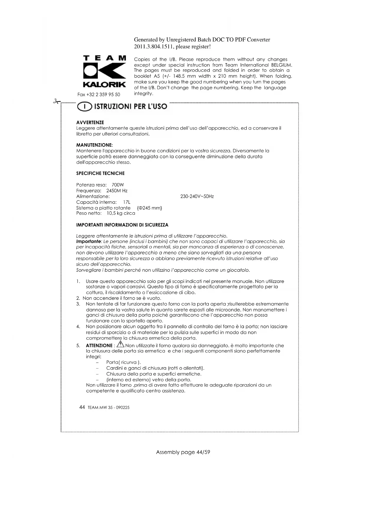 ATTENZIONE: QUESTO APPARECCHIO DEVE ESSERE MESSO A TERRA. Evitare l‟uso di prolunghe e comunque fare sempre attenzione alla compatibilità con la potenza dell‟ apparecchio. VI consigliamo di contattare telefonicamente un elettricista per qualsiasi informazione concernente l‟installazione tecnica del vostro apparecchio. Questo prodotto è equipaggiato di fusibili di sicurezza ; per la loro sostituzione rivolgersi ad un centro assistenza qualificato(*). INTERFERENZA RADIOGenerated by Unregistered Batch DOC TO PDF Converter 2011.3.804.1511, please register! Copies of the I/B. Please reproduce them without any changes except under special instruction from Team International BELGIUM. The pages must be reproduced and folded in order to obtain a booklet A5 (+/- 148.5 mm width x 210 mm height). When folding, make sure you keep the good numbering when you turn the pages of the I/B. Don‟t change the page numbering. Keep the language integrity.