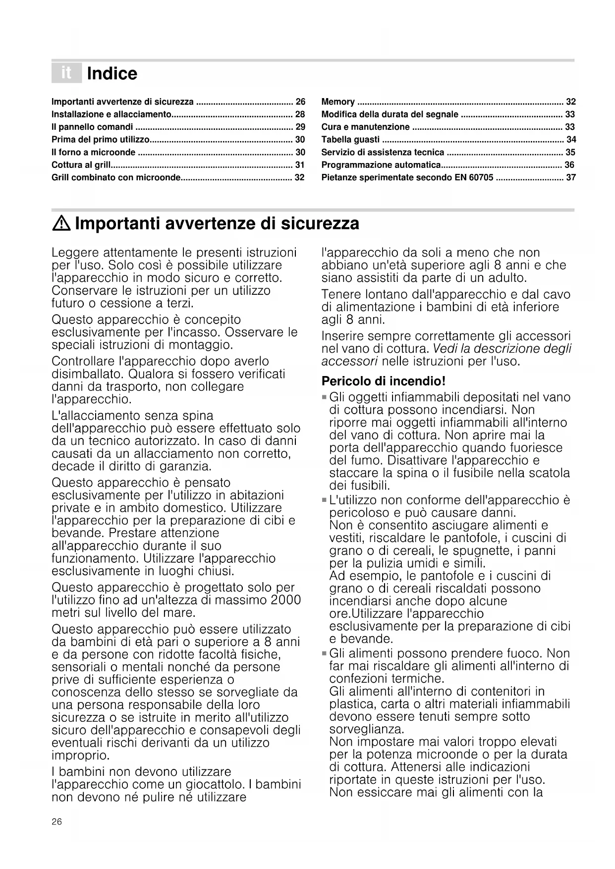 Gli alimenti possono prendere fuoco. Non far mai riscaldare gli alimenti all'interno di confezioni termiche. Gli alimenti all'interno di contenitori in plastica, carta o altri materiali infiammabili devono essere tenuti sempre sotto sorveglianza. Non impostare mai valori troppo elevati per la potenza microonde o per la durata di cottura. Attenersi alle indicazioni riportate in queste istruzioni per l'uso. Non essiccare mai gli alimenti con la27 funzione microonde. Non scongelare o riscaldare troppo a lungo o a una potenza microonde eccessiva gli alimenti a basso contenuto d'acqua, come ad es. il pane. Pericolo di incendio!