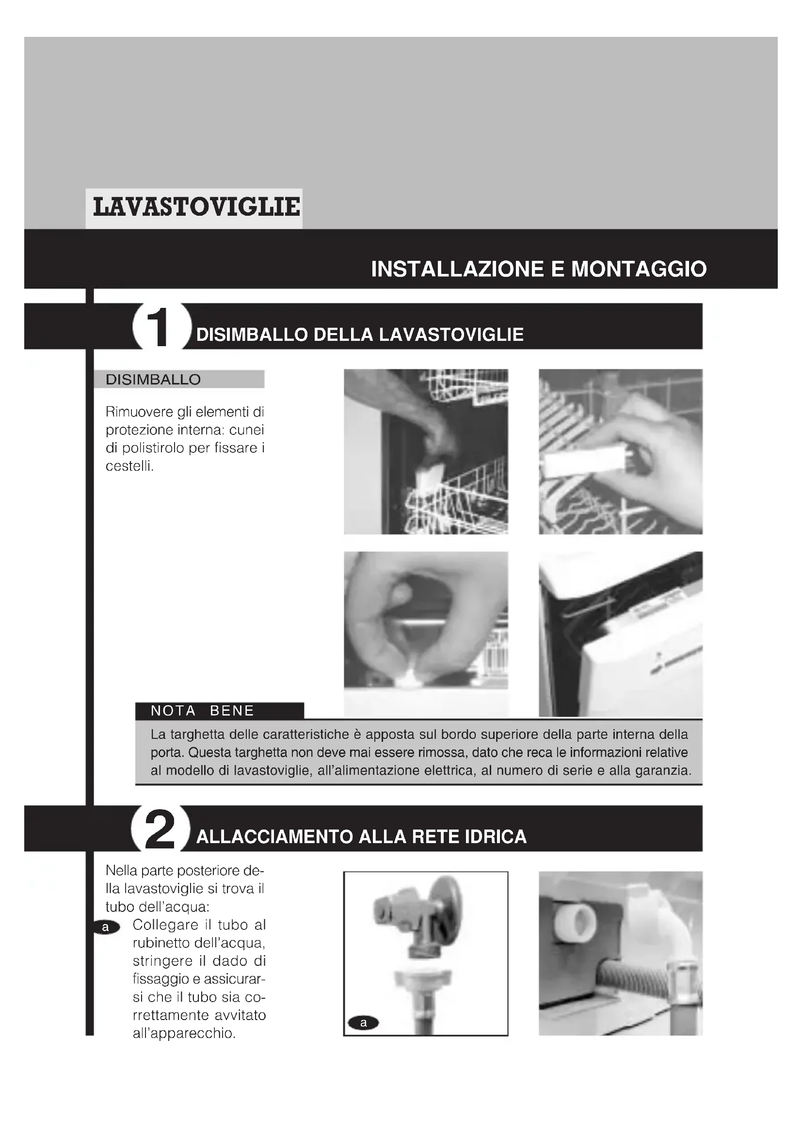 Rimuovere gli elementi di protezione interna: cunei di polistirolo per fissare i cestelli. La targhetta delle caratteristiche è apposta sul bordo superiore della parte interna dellaporta. Questa targhetta non deve mai essere rimossa, dato che reca le informazioni relativeal modello di lavastoviglie, all’alimentazione elettrica, al numero di serie e alla garanzia.NOTA BENE aIl tubo deve passare tra la parete e lo zoc- colo inferiore della la- vastoviglie (b1), allo scopo di evitare stroz- zature o una tensione eccessiva del tubo (b2). Si consiglia di predisporre un'uscita di scarico fissa, ad una distanza dal pavimento compresa tra 25 e 100 cm. Evitare che il tubo di scarico resti intrappolato e che presenti pieghe o strozzature. Prima di eseguire le con- nessioni elettriche, con- sultare la targhetta delle caratteristiche situata sul bordo superiore della por- ta. Assicurarsi che la ten- sione che arriva alla presa di corrente coincida con quella riportata sulla tar- ghetta.