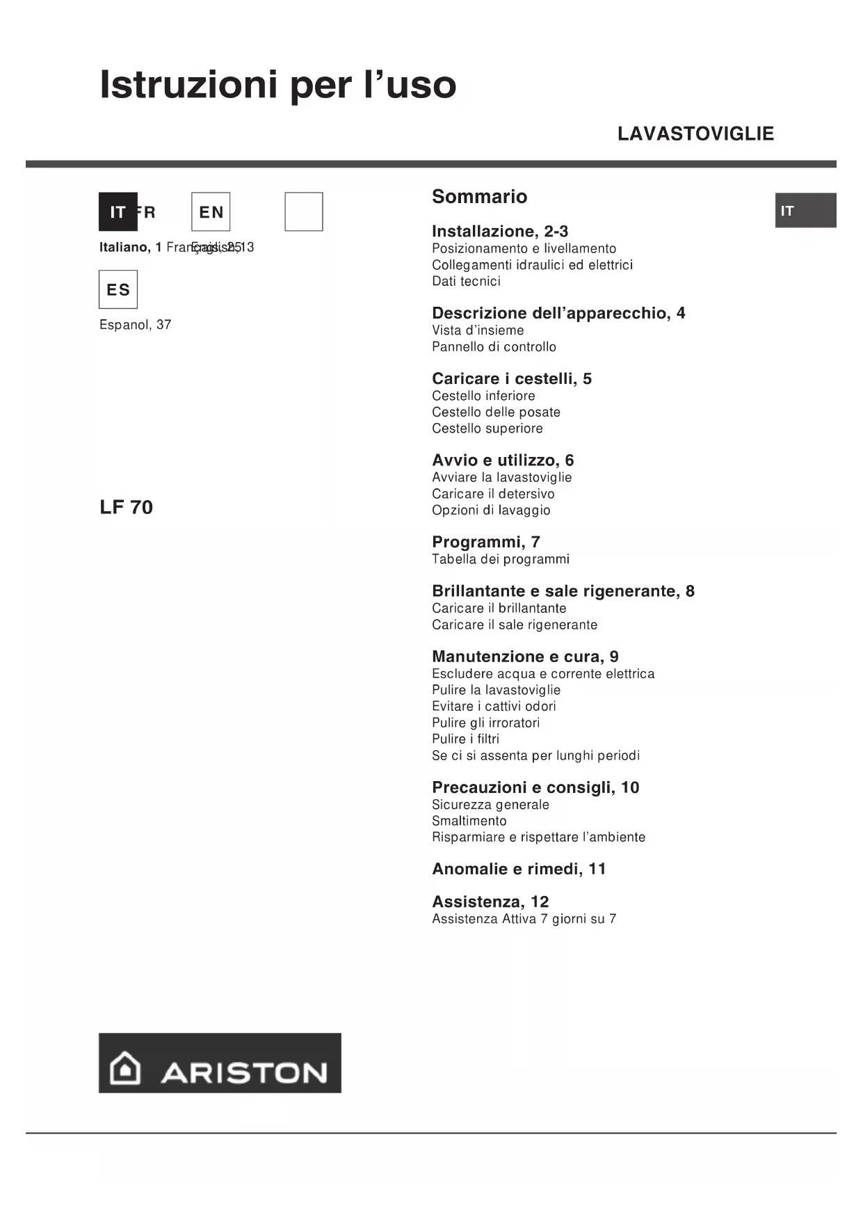 LF 70 Sommario Installazione, 2-3 Posizionamento e livellamento Collegamenti idraulici ed elettrici Dati tecnici Descrizione dellapparecchio, 4 Vista d’insieme Pannello di controllo Caricare i cestelli, 5 Cestello inferiore Cestello delle posate Cestello superiore Avvio e utilizzo, 6 Avviare la lavastoviglie Caricare il detersivo Opzioni di lavaggio Programmi, 7 Tabella dei programmi Brillantante e sale rigenerante, 8 Caricare il brillantante Caricare il sale rigenerante Manutenzione e cura, 9 Escludere acqua e corrente elettrica Pulire la lavastoviglie Evitare i cattivi odori Pulire gli irroratori Pulire i filtri Se ci si assenta per lunghi periodi Precauzioni e consigli, 10 Sicurezza generale Smaltimento Risparmiare e rispettare l’ambiente Anomalie e rimedi, 11 Assistenza, 12 Assistenza Attiva 7 giorni su 7 Italiano, 1 Français, 25 Espanol, 37 English,13