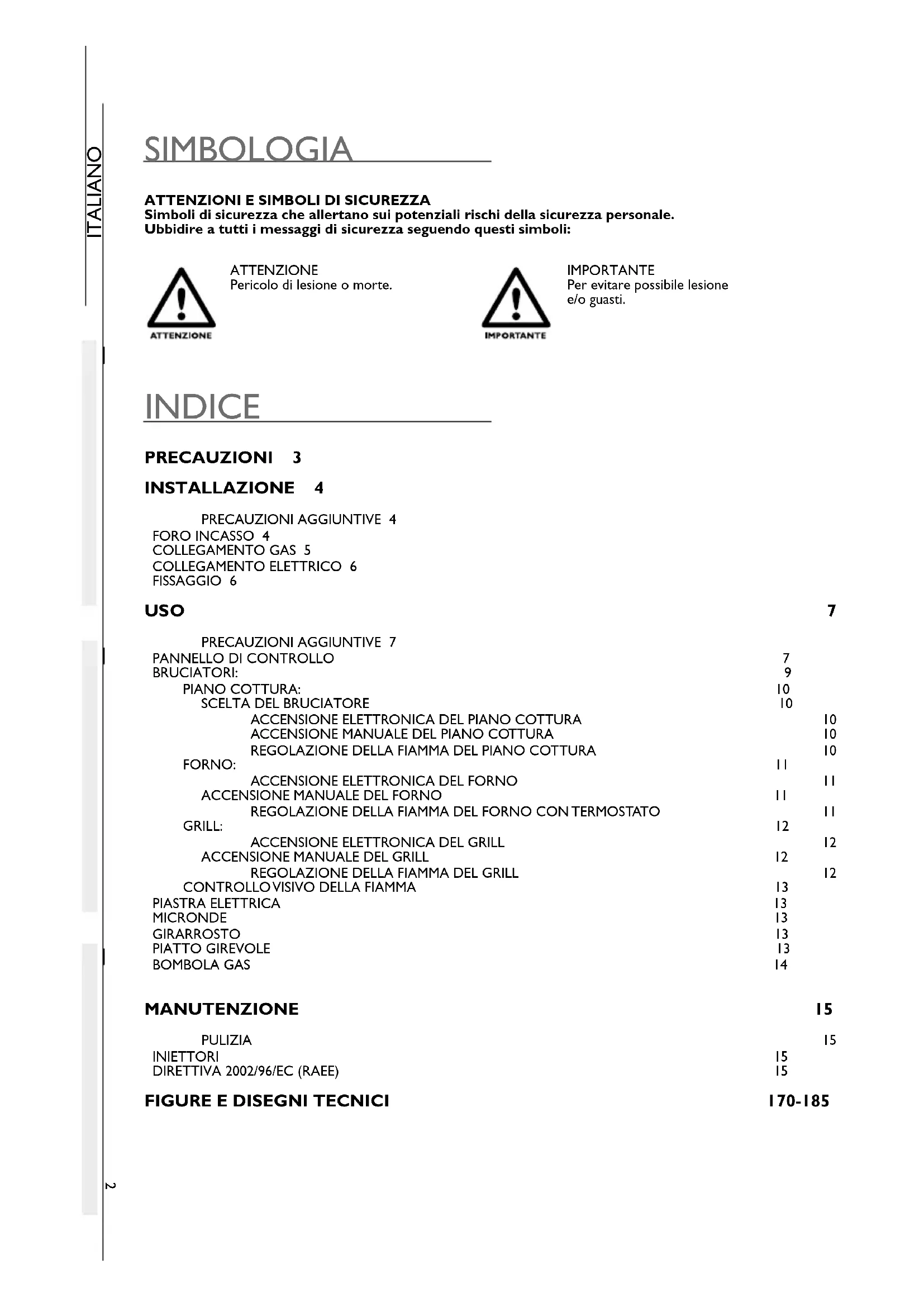 PRECAUZIONI Attenzione: questa avvertenza è collocata sull'apparecchio. Questo apparecchio deve essere installato secondo le regolamentazioni in vigore e utilizzato solamente in un ambiente ben ventilato. Consultare le istruzioni prima d’installare e d’utilizzare questo apparecchio. L’apparecchio deve essere installato da tecnici specializzati. Questo apparecchio può essere utilizzato soltanto per la cottura di cibi. Qualsiasi altro uso é considerato scorretto e perciò pericoloso. Il costruttore non é responsabile per danni a cose e persone causate da una non corretta installazione o da uso improprio, incorretto o irresponsabile. L'apparecchio e le sue parti accessibili diventano molto calde durante l'uso. Fare molta attenzione a non toccare gli elementi riscaldanti. I bambini con meno di 8 anni di età devono essere tenuti lontani se non continuamente sorvegliati. Questo apparecchio può essere utilizzato da bambini dagli 8 anni in su e da persone con capacità fisiche, sensoriali o mentali ridotte o con mancanza di esperienza e conoscenza, a condizione che siano sorvegliati o che abbiano ricevuto istruzioni per l'utilizzo dell'apparecchio in modo sicuro per capire i rischi inerenti. I bambini non devono giocare con l'apparecchio. Lasciare un fornello incustodito con grassi o oli può essere pericoloso e provocare un incendio. Non cercare mai di spegnere un eventuale incendio con acqua ma spegnere l'apparecchio e poi coprire la fiamma con un coperchio o una coperta antincendio. Pericolo di incendio: non conservare oggetti sulle superfici di cottura. Questo apparecchio non è concepito per funzionare con un temporizzatore esterno né con un sistema di comando a distanza. Se il cavo di alimentazione è danneggiato, deve essere sostituito dal costruttore o il suo servizio di assistenza tecnica o comunque da una persona con qualifica similare, in modo da prevenire ogni rischio.INSTALLAZIONEUSOMANUTENZIONE