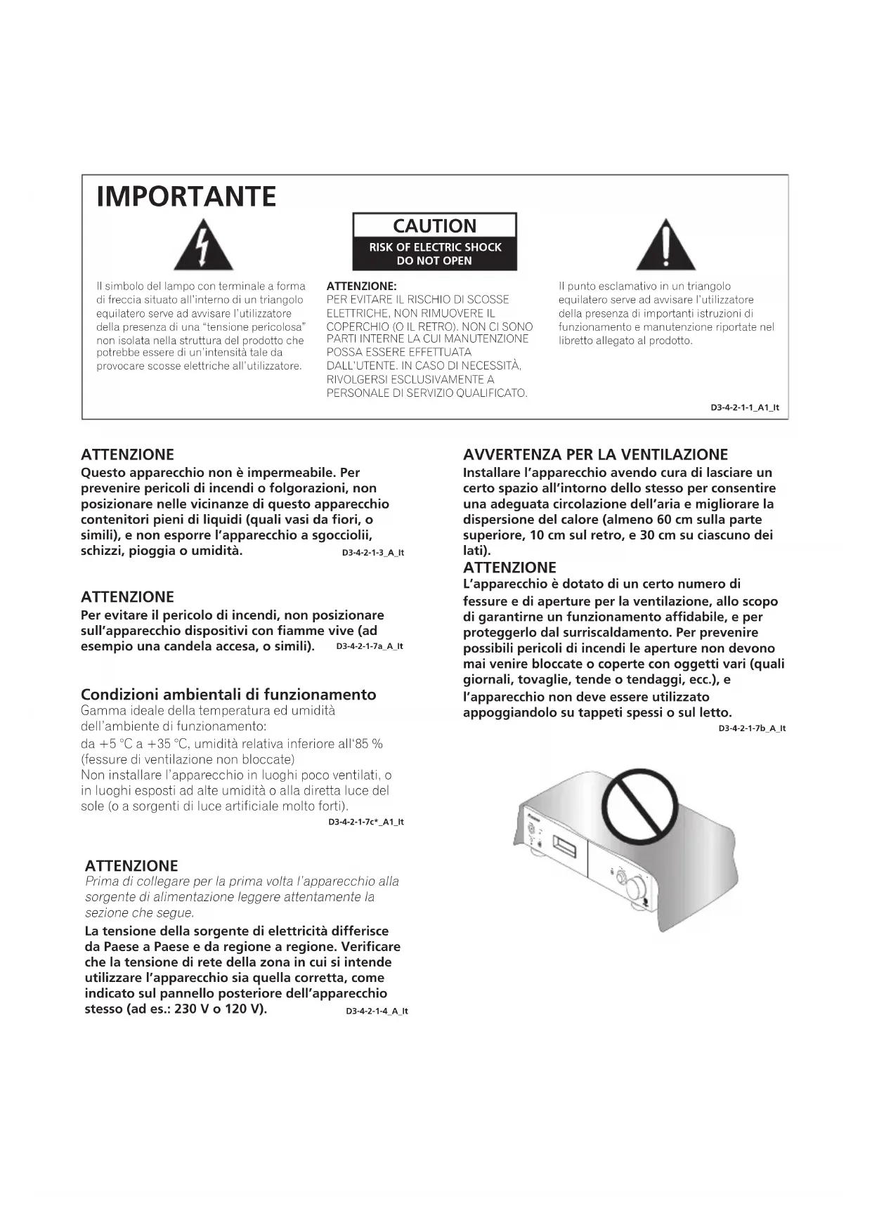 IMPORTANTE D3-4-2-1-1_A1_It ATTENZIONE Questo apparecchio non è impermeabile. Per prevenire pericoli di incendi o folgorazioni, non posizionare nelle vicinanze di questo apparecchio contenitori pieni di liquidi (quali vasi da fiori, o simili), e non esporre l’apparecchio a sgocciolii, schizzi, pioggia o umidità. D3-4-2-1-3_A_It ATTENZIONE Per evitare il pericolo di incendi, non posizionare sull’apparecchio dispositivi con fiamme vive (ad esempio una candela accesa, o simili). D3-4-2-1-7a_A_It Condizioni ambientali di funzionamento Gamma ideale della temperatura ed umidità dell’ambiente di funzionamento: da +5 °C a +35 °C, umidità relativa inferiore all‘85 % (fessure di ventilazione non bloccate) Non installare l’apparecchio in luoghi poco ventilati, o in luoghi esposti ad alte umidità o alla diretta luce del sole (o a sorgenti di luce artificiale molto forti). D3-4-2-1-7c*_A1_It ATTENZIONE La tensione della sorgente di elettricità differisce da Paese a Paese e da regione a regione. Verificare che la tensione di rete della zona in cui si intende utilizzare l’apparecchio sia quella corretta, come indicato sul pannello posteriore dell’apparecchio stesso (ad es.: 230 V o 120 V). D3-4-2-1-4_A_It Prima di collegare per la prima volta l’apparecchio alla sezione che segue. sorgente di alimentazione leggere attentamente la