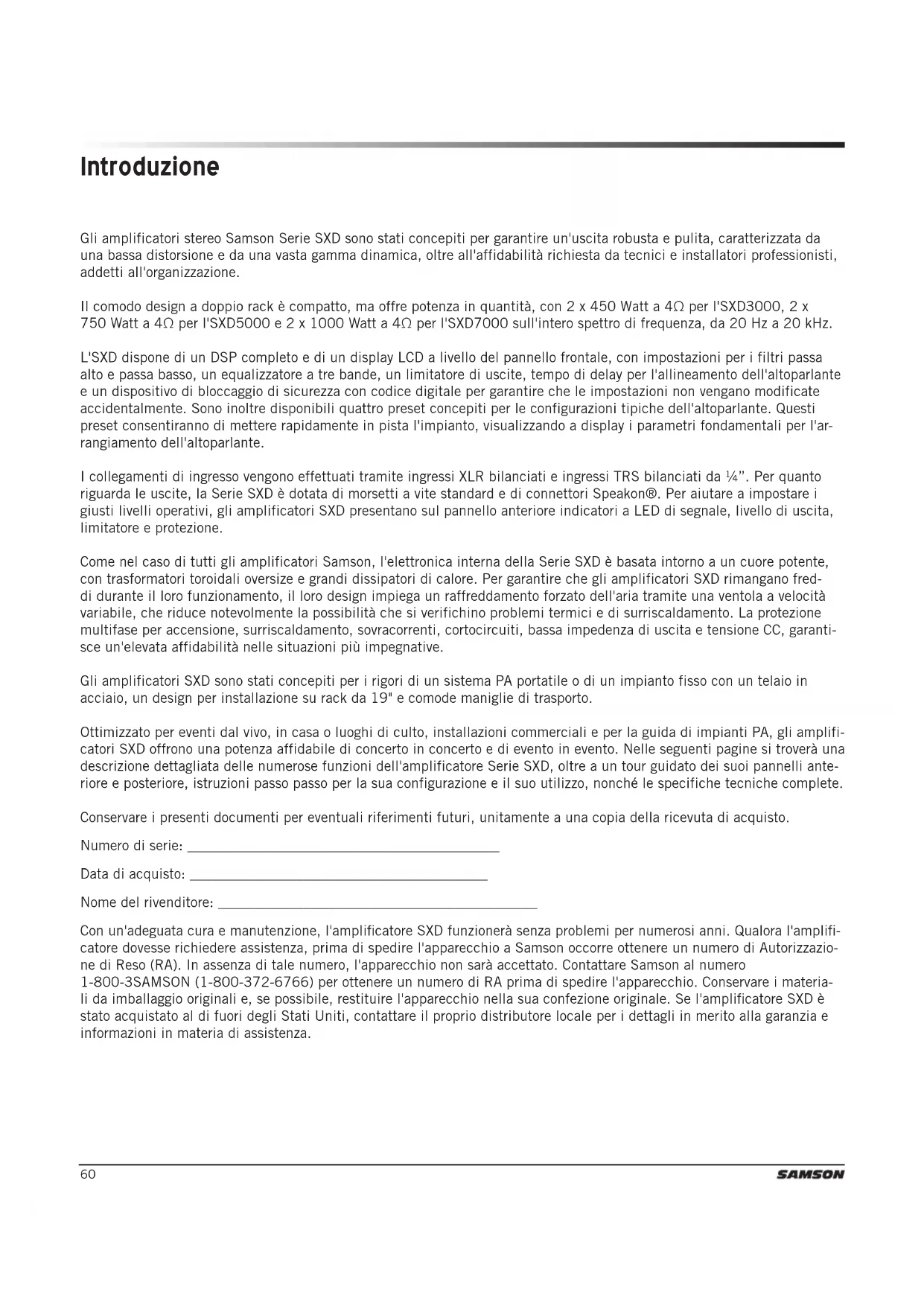 Con un'adeguata cura e manutenzione, l'amplificatore SXD funzionerà senza problemi per numerosi anni. Qualora l'amplificatore dovesse richiedere assistenza, prima di spedire l'apparecchio a Samson occorre ottenere un numero di Autorizzazione di Reso (RA). In assenza di tale numero, l'apparecchio non sarà accettato. Contattare Samson al numero 1-800-3SAMSON (1-800-372-6766) per ottenere un numero di RA prima di spedire l'apparecchio. Conservare i materiali da imballaggio originali e, se possibile, restituire l'apparecchio nella sua confezione originale. Se l'amplificatore SXD è stato acquistato al di fuori degli Stati Uniti, contattare il proprio distributore locale per i dettagli in merito alla garanzia e informazioni in materia di assistenza.