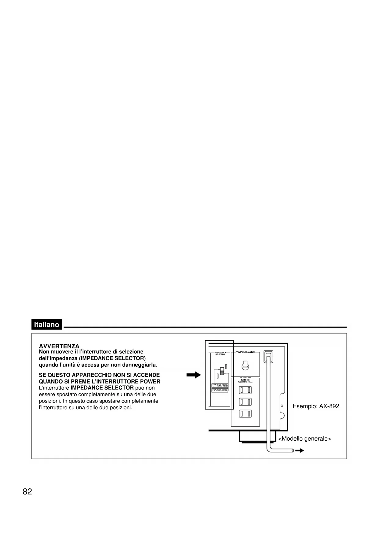 L’interruttore IMPEDANCE SELECTOR può non essere spostato completamente su una delle due posizioni. In questo caso spostare completamente l’interruttore su una delle due posizioni. IMPEDANCE SELECTOR AC OUTLETS SWITCHIED