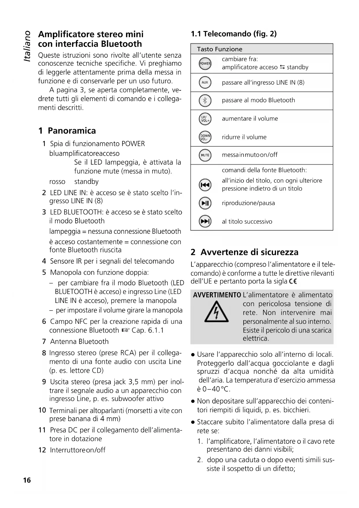 L'amplificatore stereo mini SA-160BT con telecomando IR è previsto per usi universali, p. es. a casa. A scelta, si può impostare la riproduzione di una fonte audio collegata con livello Line (p. es.lettore CD o DVD, PC) oppure la riproduzione di una fonte Bluetooth (p. es. smartphone, tablet-PC, notebook). La connessione Bluetooth si crea fácilmentetramite NFC ("near field communication"),se la fonte Bluetooth supporta tale Tecnologia.