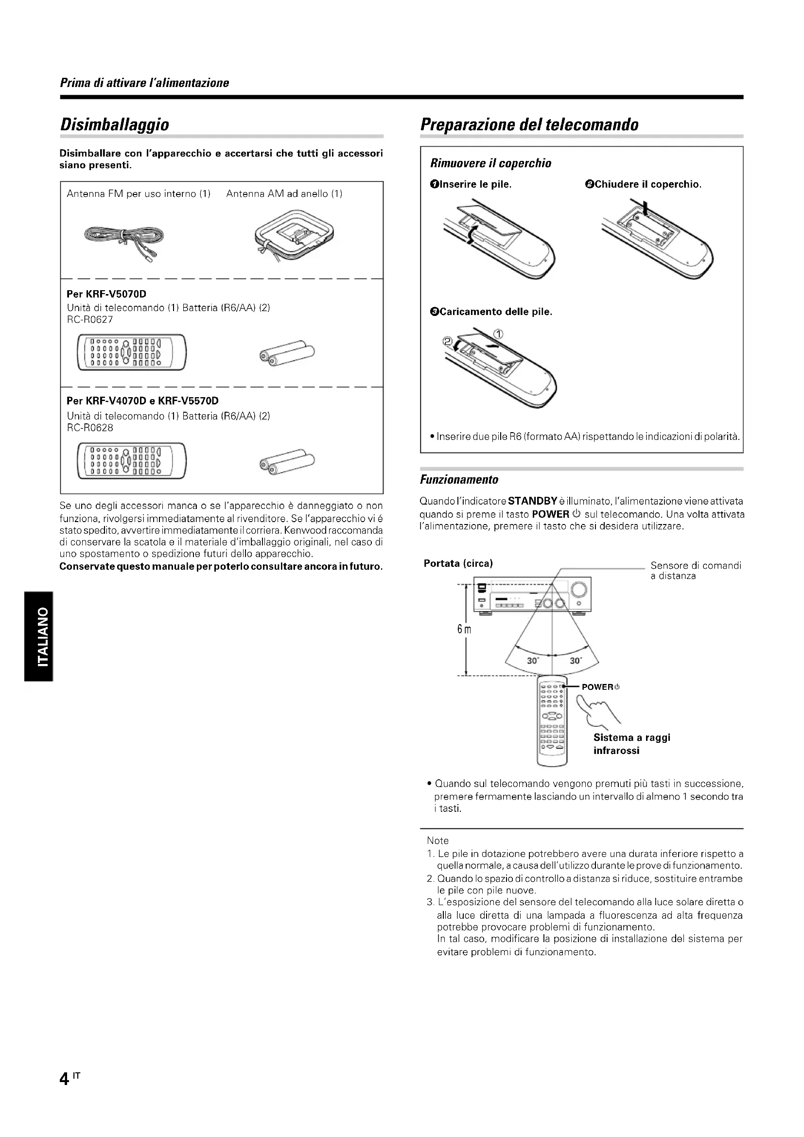 ITALIANO Prima di attivare l’alimentazione Disimballaggio Disimballare con l’apparecchio e accertarsi che tutti gli accessorisiano presenti.Antenna FM per uso interno (1)Antenna AM ad anello (1)Per KRF-V5070DUnità di telecomando (1) Batteria (R6/AA) (2)RC-R0627Per KRF-V4070D e KRF-V5570DUnità di telecomando (1) Batteria (R6/AA) (2)RC-R0628Se uno degli accessori manca o se l’apparecchio è danneggiato o nonfunziona, rivolgersi immediatamente al rivenditore. Se l’apparecchio vi éstato spedito, avvertire immediatamente il corriera. Kenwood raccomandadi conservare la scatola e il materiale d’imballaggio originali, nel caso diuno spostamento o spedizione futuri dello apparecchio.Conservate questo manuale per poterlo consultare ancora in futuro. 6 m POWER Rimuovere il coperchio Preparazione del telecomando