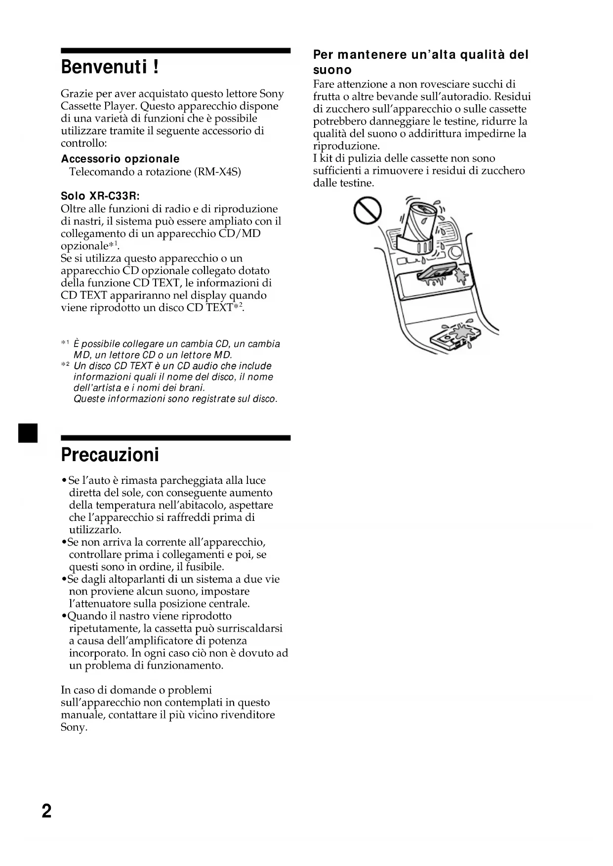 Benvenuti ! Grazie per aver acquistato questo lettore Sony Cassette Player. Questo apparecchio dispone di una varietà di funzioni che è possibile utilizzare tramite il seguente accessorio di controllo: Accessorio opzionale Telecomando a rotazione (RM-X4S) Solo XR-C33R: Oltre alle funzioni di radio e di riproduzione di nastri, il sistema può essere ampliato con il collegamento di un apparecchio CD/MD opzionale*