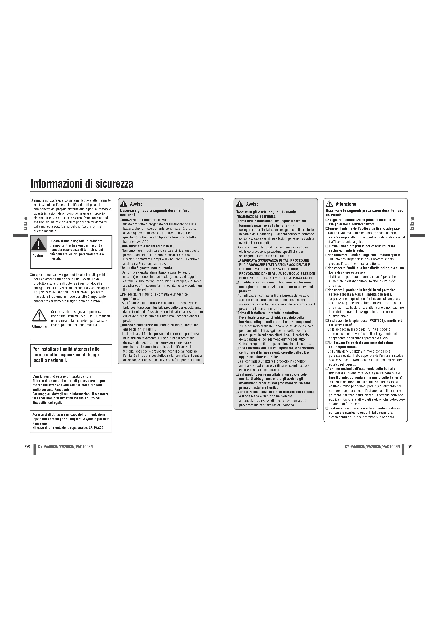 Scarica le istruzioni per il tuo Autoradio in formato PDF gratuitamente! Trova il tuo manuale CYPAD1003N - PANASONIC e riprendi in mano il tuo dispositivo elettronico. In questa pagina sono pubblicati tutti i documenti necessari per l'utilizzo del tuo dispositivo. CYPAD1003N del marchio PANASONIC.