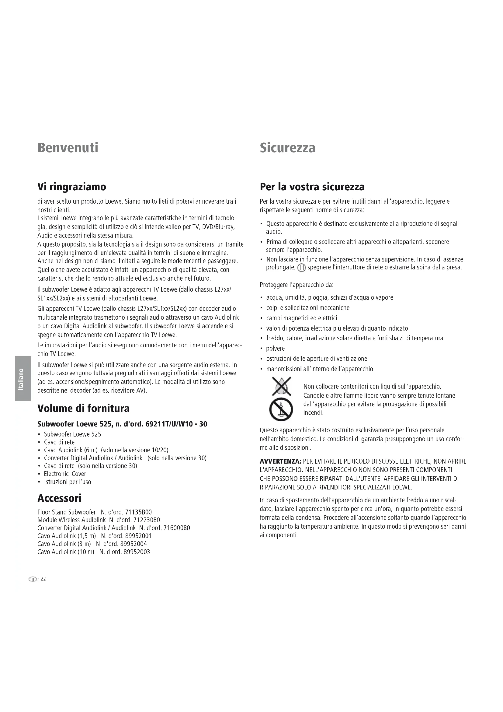 CHE POSSONO ESSERE RIPARATI DALL'UTENTE. AFFIDARE GLI INTERVENTI DI RIPARAZIONE SOLO A RIVENDITORI SPECIALIZZATI LOEWE. In caso di spostamento dell'apparecchio da un ambiente freddo a uno riscal- dato, lasciare l'apparecchio spento per circa un'ora, in quanto potrebbe essersi formata della condensa. Procedere all‘accensione soltanto quando l‘apparecchio ha raggiunto la temperatura ambiente. In questo modo si prevengono seri danni ai componenti. Sicurezza23 - Italiano Pulizia Pulire l'apparecchio utilizzando unicamente un panno umido, morbido e pulito (senza detergenti aggressivi o abrasivi). Installazione del subwoofer Principi di base