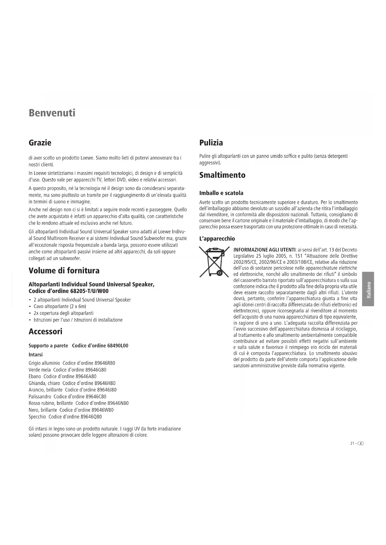 - Istruzioni per l‘uso / Istruzioni di installazione Accessori Supporto a parete Codice d’ordine 68490L00 Intarsi Grigio alluminio Codice d’ordine 89646R80 Verde mela Codice d’ordine 89646G80 Ebano Codice d’ordine 89646A80 Ghianda, chiaro Codice d’ordine 89646H80 Arancio, brillante Codice d’ordine 89646J80 Palissandro Codice d’ordine 89646C80 Rosso rubino, brillante Codice d’ordine 89646N80 Nero, brillante Codice d’ordine 89646W80 Specchio Codice d’ordine 89646Q80 Gli intarsi in legno sono un prodotto naturale. I raggi UV (la forte irradiazione solare) possono provocare delle leggere alterazioni di colore. Pulizia Pulire gli altoparlanti con un panno umido soffi ce e pulito (senza detergenti aggressivi). Smaltimento Imballo e scatola Avete scelto un prodotto tecnicamente superiore e duraturo. Per lo smaltimento dell‘imballaggio abbiamo devoluto un sussidio all‘azienda che ritira l‘imballaggio dal rivenditore, in conformità alle disposizioni nazionali. Tuttavia, consigliamo di conservare bene il cartone originale e il materiale d‘imballaggio, di modo che l‘ap- parecchio possa essere trasportato con una protezione ottimale in caso di necessità. L‘apparecchio INFORMAZIONE AGLI UTENTI: ai sensi dell’art. 13 del Decreto Legislativo 25 luglio 2005, n. 151 “Attuazione delle Direttive 2002/95/CE, 2002/96/CE e 2003/108/CE, relative alla riduzione dell‘uso di sostanze pericolose nelle apparecchiature elettriche ed elettroniche, nonché allo smaltimento dei rifiuti” il simbolo del cassonetto barrato riportato sull’apparecchiatura o sulla sua confezione indica che il prodotto alla fine della propria vita utile deve essere raccolto separatamente dagli altri rifiuti. L’utente dovrà, pertanto, conferire l’apparecchiatura giunta a fine vita agli idonei centri di raccolta differenziata dei rifiuti elettronici ed elettrotecnici, oppure riconsegnarla al rivenditore al momento dell’acquisto di una nuova apparecchiatura di tipo equivalente, in ragione di uno a uno. L’adeguata raccolta differenziata per l’avvio successivo dell’apparecchiatura dismessa al riciclaggio, al trattamento e allo smaltimento ambientalmente compatibile contribuisce ad evitare possibili effetti negativi sull’ambiente e sulla salute e favorisce il reimpiego e/o riciclo dei materiali di cui è composta l’apparecchiatura. Lo smaltimento abusivo del prodotto da parte dell’utente comporta l’applicazione delle sanzioni amministrative previste dalla normativa vigente.- 22 Italiano Per la vostra sicurezza Per la vostra sicurezza e per evitare inutili danni all‘apparecchio, leggere e rispettare le seguenti norme di sicurezza.