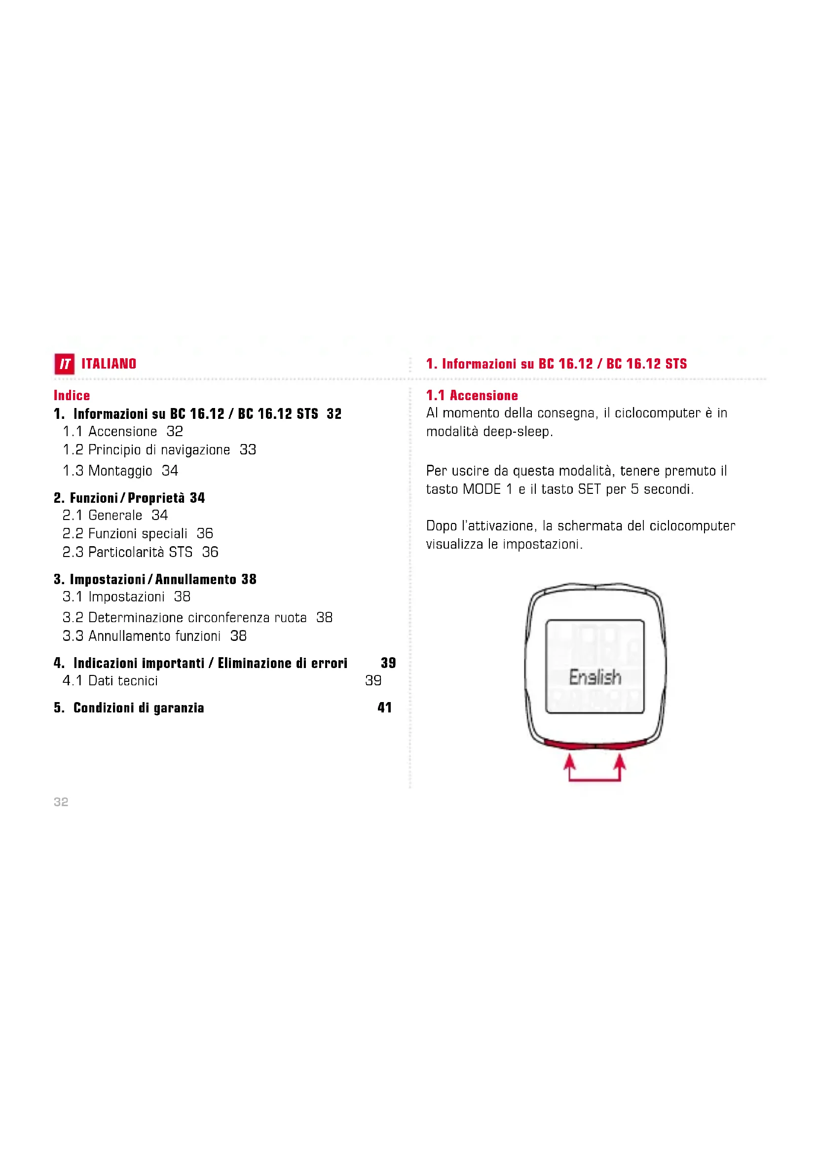 Al momento della consegna, il ciclocomputer è in modalità deep-sleep. Per uscire da questa modalità, tenere premuto il tasto MODE 1 e il tasto SET per 5 secondi. Dopo l’attivazione, la schermata del ciclocomputer visualizza le impostazioni.
