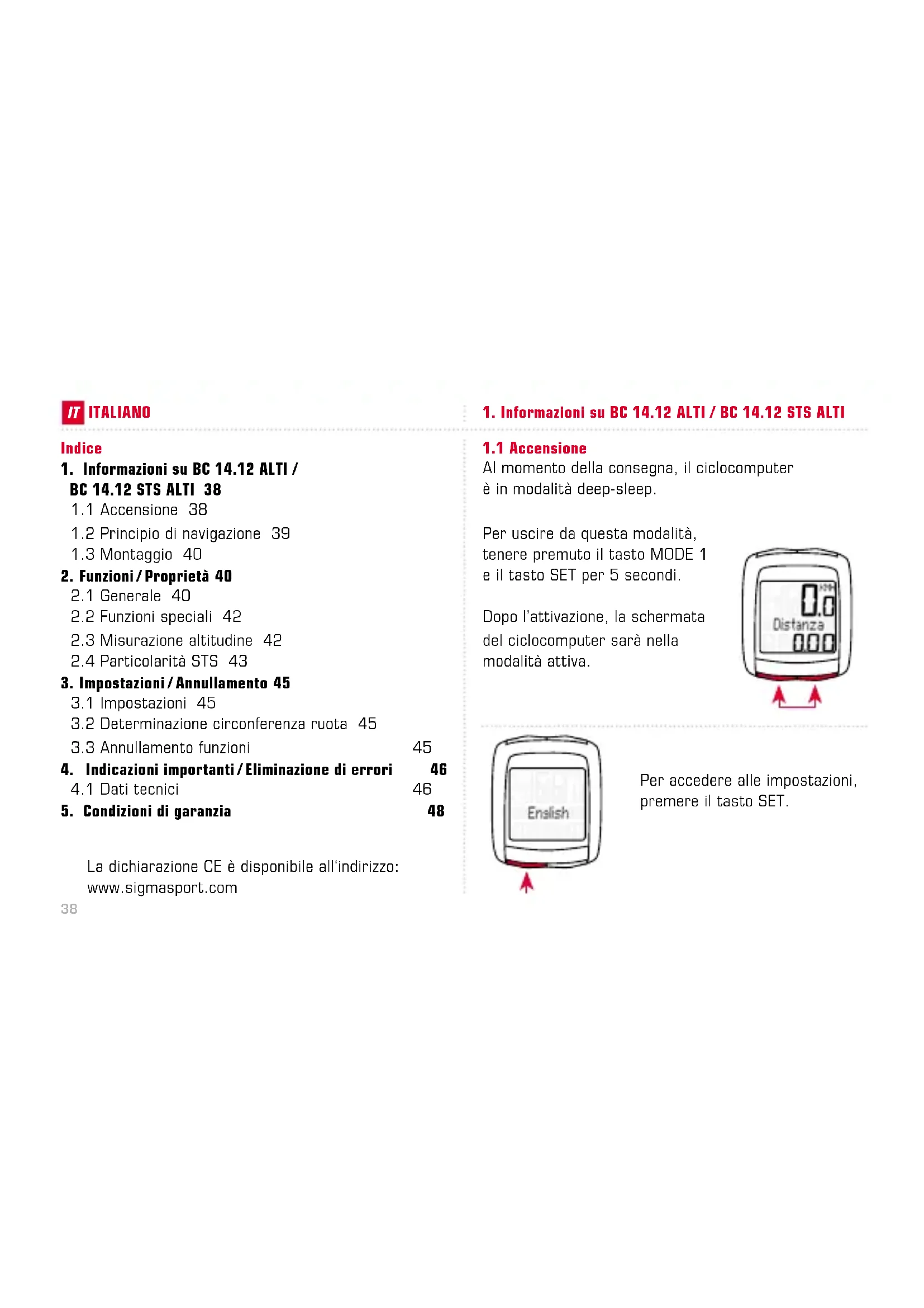 Al momento della consegna, il ciclocomputer è in modalità deep-sleep. Per uscire da questa modalità, tenere premuto il tasto MODE 1 e il tasto SET per 5 secondi. Dopo l’attivazione, la schermata del ciclocomputer sarà nella modalità attiva. Per accedere alle impostazioni, premere il tasto SET.39