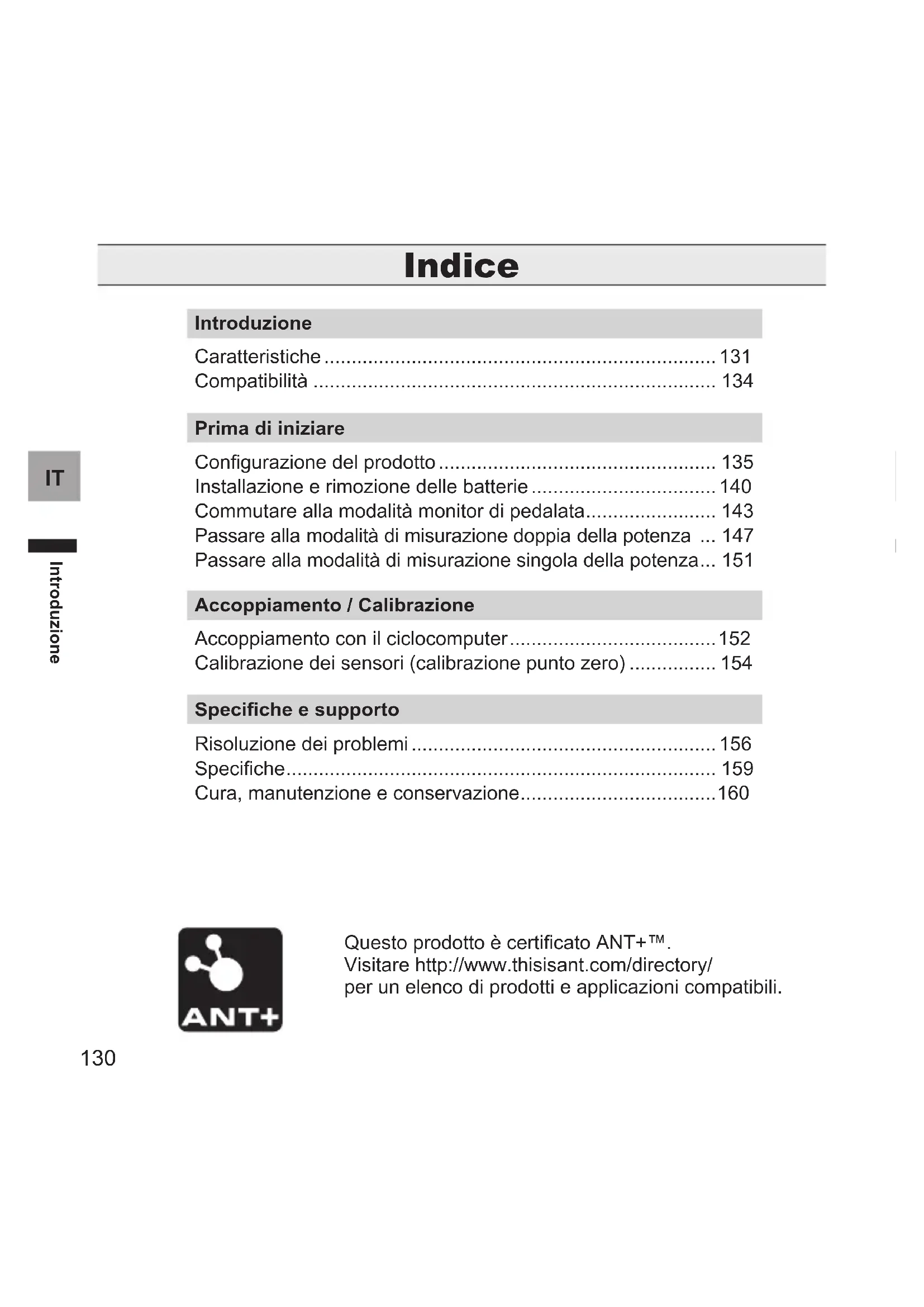 - Cura, manutenzione e conservazione Introduzione Questo prodotto è certicato ANT+™. Visitare http://www.thisisant.com/directory/ per un elenco di prodotti e applicazioni compatibili.131 p. 160