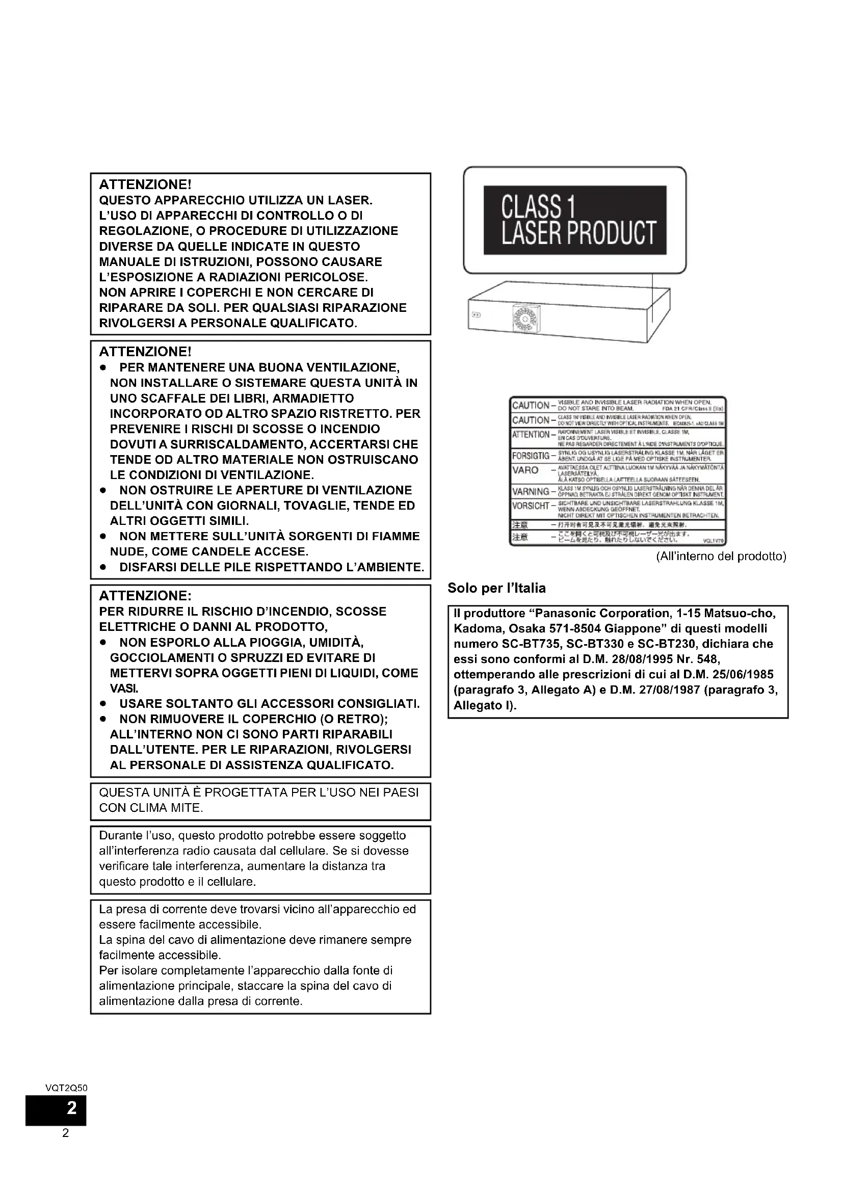 AL PERSONALE DI ASSISTENZA QUALIFICATO. QUESTA UNITÀ È PROGETTATA PER L’USO NEI PAESI CON CLIMA MITE. Durante l’uso, questo prodotto potrebbe essere soggetto all’interferenza radio causata dal cellulare. Se si dovesse verificare tale interferenza, aumentare la distanza tra questo prodotto e il cellulare. La presa di corrente deve trovarsi vicino all’apparecchio ed essere facilmente accessibile. La spina del cavo di alimentazione deve rimanere sempre facilmente accessibile. Per isolare completamente l’apparecchio dalla fonte di alimentazione principale, staccare la spina del cavo di alimentazione dalla presa di corrente. Il produttore “Panasonic Corporation, 1-15 Matsuo-cho, Kadoma, Osaka 571-8504 Giappone” di questi modelli numero SC-BT735, SC-BT330 e SC-BT230, dichiara che essi sono conformi al D.M. 28/08/1995 Nr. 548, ottemperando alle prescrizioni di cui al D.M. 25/06/1985 (paragrafo 3, Allegato A) e D.M. 27/08/1987 (paragrafo 3, Allegato I).
