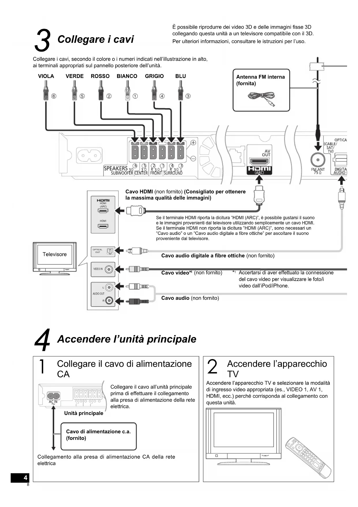 (non fornito) Cavo HDMI (non fornito) (Consigliato per ottenere la massima qualità delle immagini) Cavo audio digitale a fi bre ottiche (non fornito) Accendere l’unità principale Collegare il cavo di alimentazione