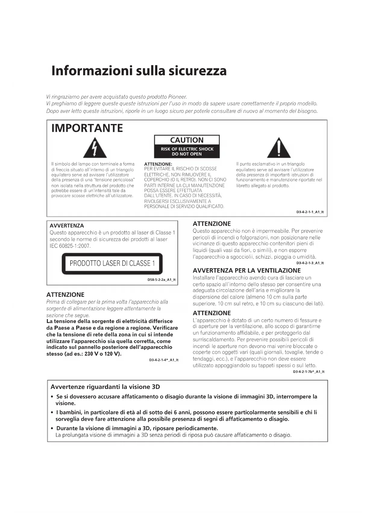 IMPORTANTE D3-4-2-1-1_A1_ItAVVERTENZAQuesto apparecchio è un prodotto al laser di Classe 1 secondo le norme di sicurezza dei prodotti al laser IEC 60825-1:2007.
