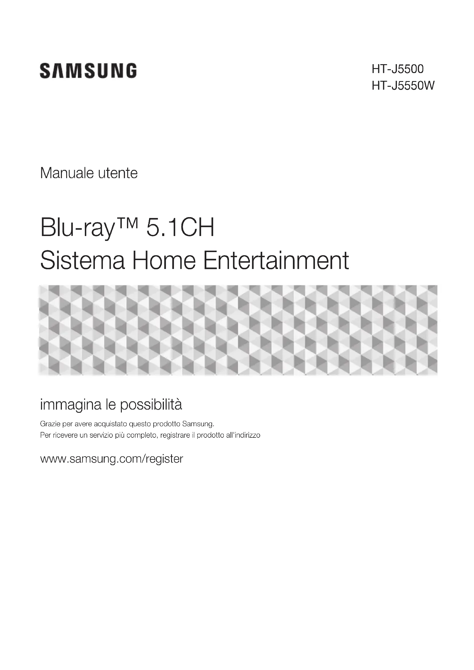 Europe UK 0330 SAMSUNG (7267864) www.samsung.com/uk/supportIRELAND (EIRE) 0818 717100 www.samsung.com/ie/supportGERMANY 06196 77 555 77 www.samsung.com/de/supportFRANCE 01 48 63 00 00 www.samsung.com/fr/supportITALIA 800-SAMSUNG (800.7267864) www.samsung.com/it/supportSPAIN 0034902172678 www.samsung.com/es/supportPORTUGAL 808 207 267 www.samsung.com/pt/supportLUXEMBURG 261 03 710 www.samsung.com/be_fr/supportNETHERLANDS 088 90 90 100 www.samsung.com/nl/supportBELGIUM 02-201-24-18www.samsung.com/be/support (Dutch) www.samsung.com/be_fr/support (French)NORWAY 815 56480 www.samsung.com/no/supportDENMARK 707 019 70 www.samsung.com/dk/supportFINLAND 030-6227 515 www.samsung.com/fi/supportSWEDEN 0771 726 786 www.samsung.com/se/supportPOLAND801-172-678* lub +48 22 607-93-33** (koszt połączenia według taryfy operatora)http://www.samsung.com/pl/support/HUNGARY 0680SAMSUNG (0680-726-7864) www.samsung.com/hu/supportAUSTRIA0800-SAMSUNG (0800-7267864)[Only for Dealers] 0810-112233www.samsung.com/at/supportCountry Contact Centre Web SiteSWITZERLAND 0800 726 78 64 (0800-SAMSUNG)www.samsung.com/ch/support (German) www.samsung.com/ch_fr/support (French)CZECH 800 - SAMSUNG (800-726786) www.samsung.com/cz/supportSLOVAKIA 0800 - SAMSUNG (0800-726 786) www.samsung.com/sk/supportCROATIA 072 726 786 www.samsung.com/hr/supportBOSNIA 055 233 999www.samsung.com/supportMONTENEGRO 020 405 888 SLOVENIA 080 697 267 (brezplačna številka) www.samsung.com/si/support SERBIA 011 321 6899 www.samsung.com/rs/supportALBANIA 045 620 202 www.samsung.com/al/supportBULGARIA*3000 Цена в мрежата0800 111 31 , Безплатна телефонна линияwww.samsung.com/bg/supportROMANIA*8000 (apel in retea)08008-726-78-64 (08008-SAM-SUNG) Apel GRATUITwww.samsung.com/ro/supportCYPRUS 8009 4000 only from landline, toll freewww.samsung.com/gr/supportGREECE80111-SAMSUNG (80111 726 7864) only from land line(+30) 210 6897691 from mobile and land lineLITHUANIA 8-800-77777 www.samsung.com/lt/supportLATVIA 8000-7267 www.samsung.com/lv/supportESTONIA 800-7267 www.samsung.com/ee/supportBlu-ray™ 5.1CH Sistema Home Entertainment Manuale utente HT-J5500 HT-J5550W immagina le possibilità Grazie per avere acquistato questo prodotto Samsung. Per ricevere un servizio più completo, registrare il prodotto all'indirizzo www.samsung.com/register2 - Italiano Informazioni Sulla sicurezza Prodotto di Classe II: Questo simbolo indica che il prodotto non necessita di una connessione di sicurezza alla terra.Tensione CA: Questo simbolo indica che la tensione contrassegnata con questo simbolo è di tipo CA.Tensione CC : Questo simbolo indica che la tensione contrassegnata con questo simbolo è di tipo CC.Attenzione, consultare le Istruzioni per l’uso: Questo simbolo indica all’utente la necessità di consultare il manuale dell’utente per ottenere ulteriori informazioni sulla sicurezza.• Nel retro o nella parte posteriore dell'apparecchio sono presenti fessure e aperture per fornire la ventilazione necessaria. Per assicurare l'affidabilità di funzionamento di questa apparecchiatura, e proteggerla dal surriscaldamento, queste fessure e aperture non devono mai essere bloccate o coperte. - Non posizionare l'apparecchio in uno spazio ristretto, come una libreria o un armadietto, che non abbia un'adeguata ventilazione. - Non collocare l'apparecchio nelle vicinanze o sopra un calorifero o una bocchetta d'aria calda, e non esporlo alla luce solare diretta. - Non collocare sull'apparecchio recipienti (vasi ecc.) contenenti acqua. Una fuoriuscita d'acqua può provocare incendi o scosse elettriche.• Non esporre questo apparecchio alla pioggia o all'acqua (vicino a vasche da bagno, catini, lavandini, lavatrici, seminterrati umidi, piscine ecc.). Se l'apparecchio si bagna, scollegarlo e contattare immediatamente un rivenditore autorizzato. Questa apparecchiatura utilizza le batterie. Ogni Paese può avere normative ambientali diverse che regolano il corretto smaltimento di queste batterie. Contattare le autorità locali per informazioni di smaltimento o riciclaggio.• Non sovraccaricare le prese a muro, le prolunghe o gli adattatori oltre alla loro capacità per evitare di provocare incendi o scosse elettriche. Disporre i cavi di alimentazione in modo che non vengano calpestati o schiacciati da oggetti collocati sopra o contro essi. Prestare particolare attenzione alle estremità dei cavi, alla prese a muro e ai punti di uscita dell'apparecchio. Per proteggere l'apparecchio dal temporale, o quando viene lasciato incustodito e inutilizzato per lunghi periodi di tempo, staccare il monitor dalla presa di rete e scollegare il sistema via cavo o antenna. Questa precauzione evita che l'unità venga danneggiata da fulmini o da picchi di corrente.• Prima di collegare il cavo di alimentazione CA all'uscita di adattatore CC, assicurarsi che la tensione nominale dell'adattatore CC corrisponda a quella dell'alimentazione elettrica locale.• Non inserire oggetti metallici nelle aperture di questa apparecchiatura. In caso contrario possono sussistere rischi di scosse elettriche.• Per evitare il rischio di scariche elettriche, non toccare mai l'interno di questa apparecchiatura. Solo un tecnico qualificato deve aprire questa apparecchiatura.• Assicurarsi di inserire il cavo di alimentazione fino a quando non è saldamente fissato. Scollegare il cavo di alimentazione dalla presa di rete tirandolo dalla spina. Non scollegare il cavo tirando il cavo stesso. Non toccare il cavo di alimentazione con le mani bagnate.• Se l'apparecchio non funziona normalmente, in particolare, se vi sono suoni insoliti o odori sospetti, scollegarlo immediatamente e contattare un rivenditore autorizzato o il centro di assistenza.• Manutenzione dell'apparecchio. - Prima di collegare altri componenti al prodotto, controllare che siano spenti. - Se il prodotto viene spostato improvvisamente da un luogo freddo a uno caldo, si può formare condensa sulle parti in funzione
