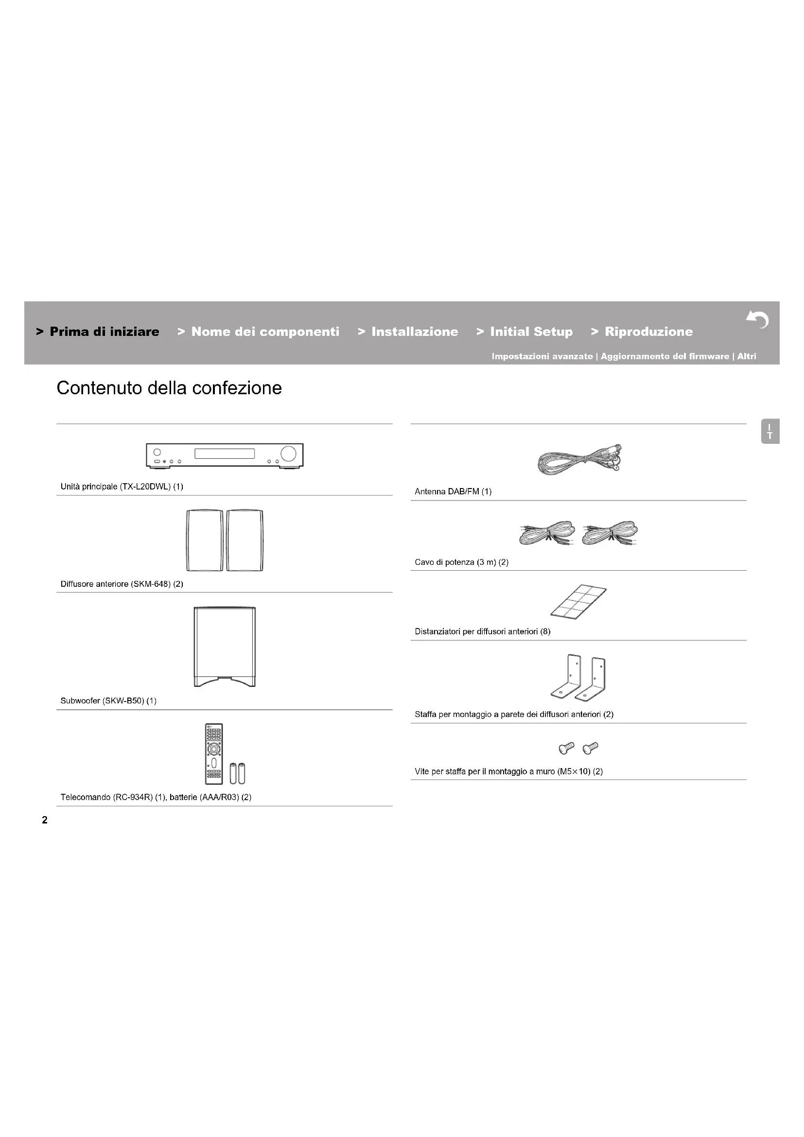 Prima di iniziare Contenuto della confezione Unità principale (TX-L20DWL) (1) Diffusore anteriore (SKM-648) (2) Subwoofer (SKW-B50) (1) Telecomando (RC-934R) (1), batterie (AAA/R03) (2) Antenna DAB/FM (1) Cavo di potenza (3 m) (2) Distanziatori per diffusori anteriori (8) Staffa per montaggio a parete dei diffusori anteriori (2) Vite per staffa per il montaggio a muro (M5k10) (2)3 > Prima di iniziare > Nome dei componenti > Installazione > Initial Setup > Riproduzione Impostazioni avanzate | Aggiornamento del firmware | Altri