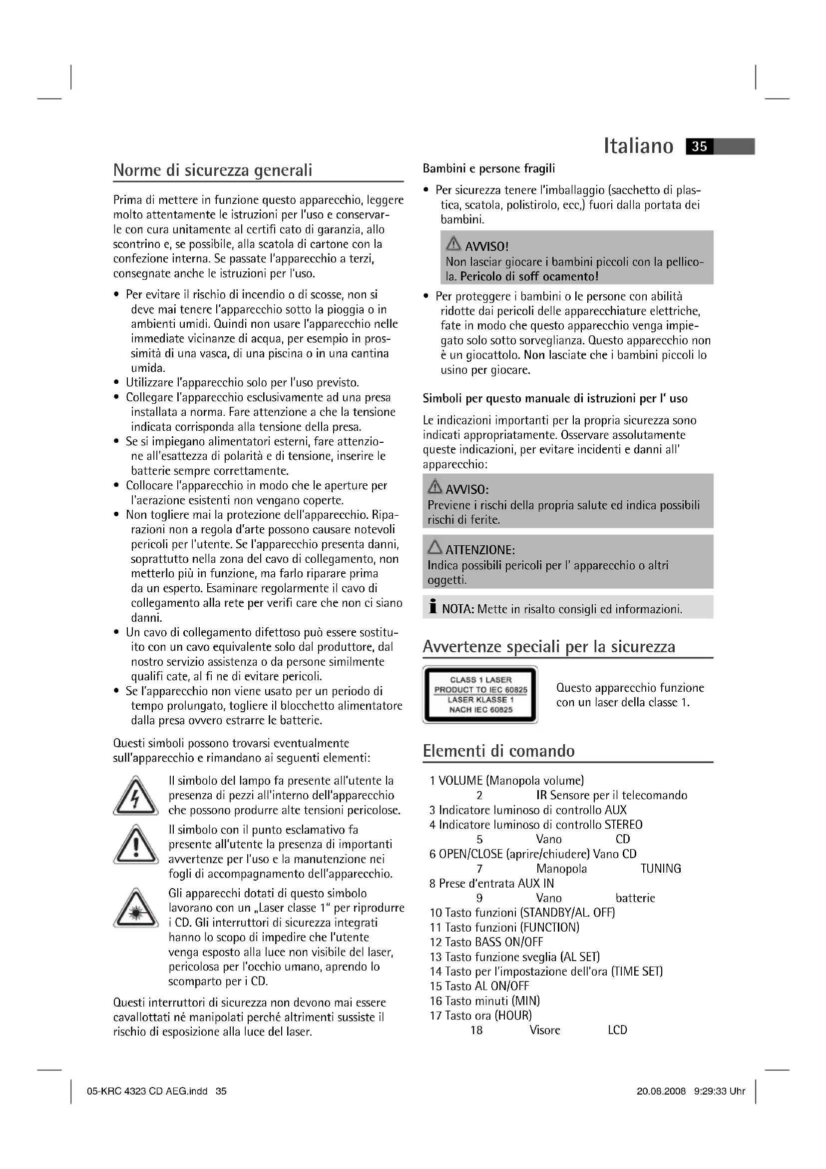 - Per proteggere i bambini o le persone con abilità ridotte dai pericoli delle apparecchiature elettriche, fate in modo che questo apparecchio venga impie- gato solo sotto sorveglianza. Questo apparecchio non è un giocattolo. Non lasciate che i bambini piccoli lo usino per giocare. Simboli per questo manuale di istruzioni per l’ uso Le indicazioni importanti per la propria sicurezza sono indicati appropriatamente. Osservare assolutamente queste indicazioni, per evitare incidenti e danni all’ apparecchio: AVVISO: Previene i rischi della propria salute ed indica possibili rischi di ferite. ATTENZIONE: Indica possibili pericoli per l’ apparecchio o altri oggetti. NOTA: Mette in risalto consigli ed informazioni. Avvertenze speciali per la sicurezza Questo apparecchio funzione con un laser della classe 1. Elementi di comando 1 VOLUME (Manopola volume) 2 IR Sensore per il telecomando 3 Indicatore luminoso di controllo AUX 4 Indicatore luminoso di controllo STEREO 5 Vano CD 6 OPEN/CLOSE (aprire/chiudere) Vano CD 7 Manopola TUNING 8 Prese d‘entrata AUX IN 9 Vano batterie 10 Tasto funzioni (STANDBY/AL. OFF) 11 Tasto funzioni (FUNCTION) 12 Tasto BASS ON/OFF 13 Tasto funzione sveglia (AL SET) 14 Tasto per l’impostazione dell’ora (TIME SET) 15 Tasto AL ON/OFF 16 Tasto minuti (MIN) 17 Tasto ora (HOUR) 18 Visore LCD 05-KRC 4323 CD AEG.indd 3505-KRC 4323 CD AEG.indd 35 20.08.2008 9:29:33 Uhr20.08.2008 9:29:33 UhrItaliano