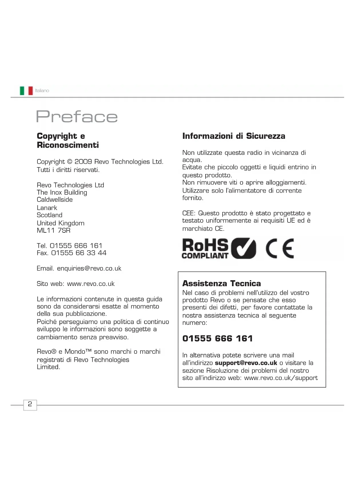 Nel caso di problemi nell'utilizzo del vosto prodotto Revo o se pensate cheesso presenti dei difetti, per favore contattate la nostra assistenza tecnica al seguente numero: