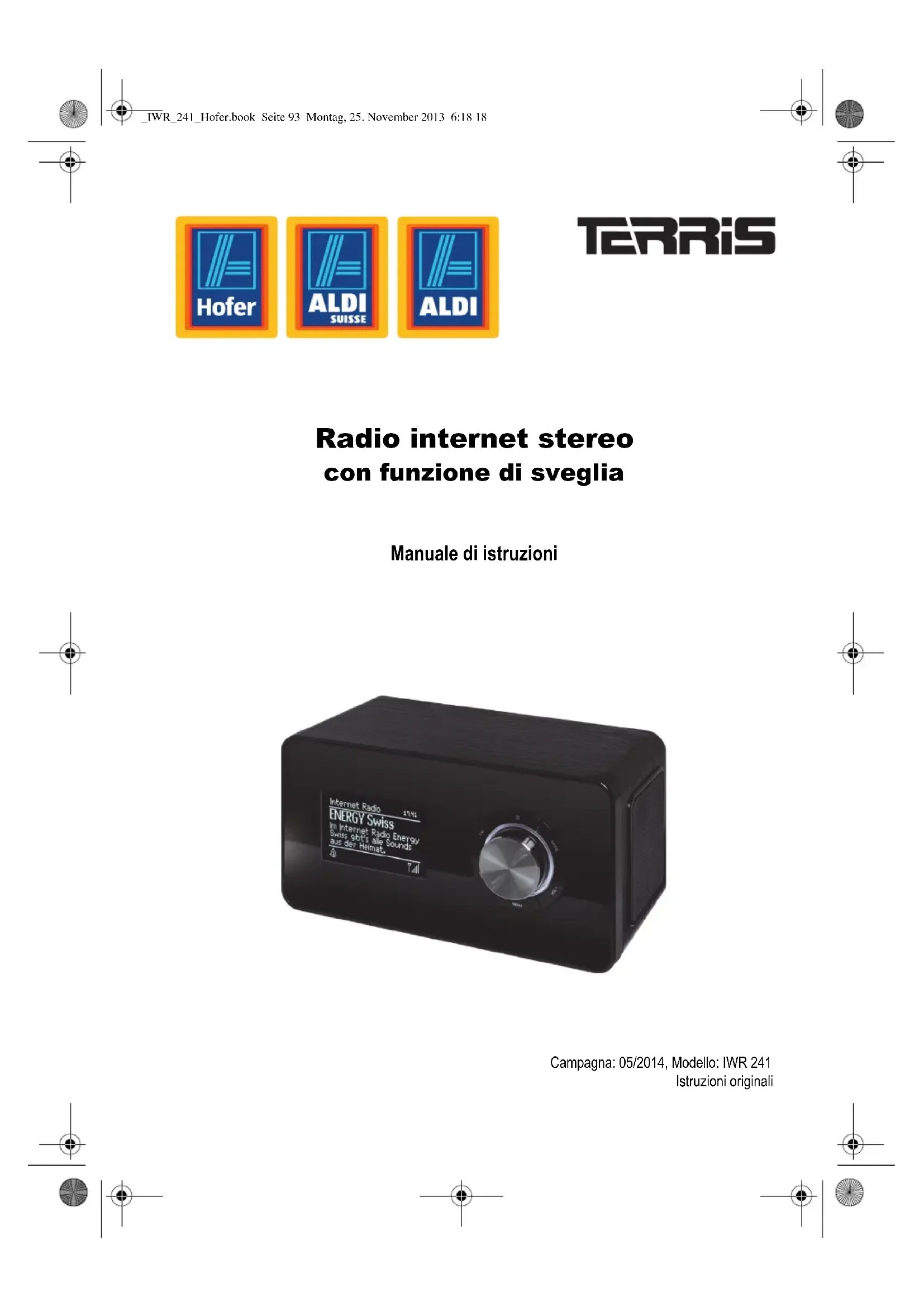 Rue : .................................................................................... Tél./courriel : .................................................................................... Signature : .................................................................................... _IWR_241_Hofer.book Seite 92 Montag, 25. November 2013 6:18 18Radio internet stereo con funzione di sveglia Manuale di istruzioni Campagna: 05/2014, Modello: IWR 241 Istruzioni originali _IWR_241_Hofer.book Seite 93 Montag, 25. November 2013 6:18 1894 Grazie per la fiducia accordataci! Congratulazioni per l'acquisto della vostra nuova radio internet stereo Terris con funzione di sveglia. Siamo certi che sarete soddisfatti di que- sto moderno apparecchio. Per assicurare sempre un funzionamento ottimale e la costante dispo- nibilità della radio internet con funzione di sveglia e garantire la vostra sicurezza personale: Leggere attentamente il presente manuale di istruzioni per l'uso prima della prima messa in funzione e attenersi soprattutto alle istruzioni per la sicurezza! Ci auguriamo che la vostra nuova radio internet con funzione di sveglia possa darvi molte soddisfazioni! Nota sulla dichiarazione di conformità Con la presente, la Globaltronics GmbH & Co. KG dichiara che questo prodotto soddisfa i requisiti fondamentali e le norme per- tinenti della Direttiva R&TTE 1999/5/CE, della Direttiva CEM 2004/108/CE, della Direttiva ErP 2009/125/CE, della Direttiva Bassa tensione 2006/95/CE e della Direttiva RoHS 2011/65/UE. La dichiarazione di conformità completa e queste istruzioni per l'uso in formato PDF sono reperibili in internet all'indirizzo www.gt-support.de. _IWR_241_Hofer.book Seite 94 Montag, 25. November 2013 6:18 1895 Materiale in dotazione Italiano Panoramica dei dati