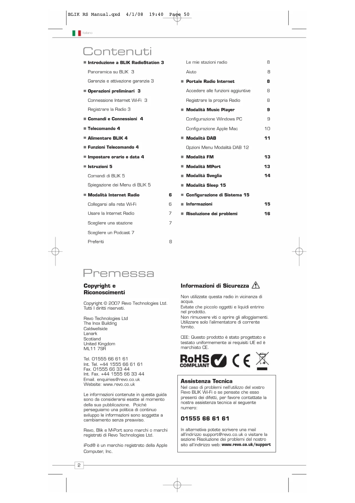 Deutsch BLIK RS Manual.qxd 4/1/08 19:40 Page 48H Y B R I D D I G I T A L R A D I O Italiano Guida Operativa BLIK RS Manual.qxd 4/1/08 19:40 Page 49Contenuti Introduzione a BLIK RadioStation 3 Panoramica su BLIK 3 Garanzia e attivazione garanzia 3 Operazioni preliminari 3 Connessione Internet Wi-Fi 3 Registrare la Radio 3 Comandi e Connessioni 4 Telecomando 4 Alimentare BLIK 4 Funzioni Telecomando 4 Impostare orario e data 4 Istruzioni 5 Comandi di BLIK 5 Spiegazione dei Menu di BLIK 5 Modalità Internet Radio 6 Collegarsi alla rete Wi-Fi 6 Usare la Internet Radio 7 Scegliere una stazione 7 Scegliere un Podcast 7 Preferiti 8 Le mie stazioni radio 8 Aiuto 8 Portale Radio Internet 8 Accedere alle funzioni aggiuntive 8 Registrare la propria Radio 8 Modalità Music Player 9 Configurazione Windows PC 9 Configurazione Apple Mac 10 Modalità DAB 11 Opzioni Menu Modalità DAB 12 Modalità FM 13 Modalità MPort 13 Modalità Sveglia 14 Modalità Sleep 15 Configurazione di Sistema 15 Informazioni 15 Risoluzione dei problemi 16 Copyright e Riconoscimenti Copyright © 2007 Revo Technologies Ltd. Tutti I diritti riservati. Revo Technologies Ltd The Inox Building Caldwellside Lanark Scotland United Kingdom ML11 7SR Tel. 01555 66 61 61 Int. Tel. +44 1555 66 61 61 Fax. 01555 66 33 44 Int. Fax. +44 1555 66 33 44 Email. enquiries@revo.co.uk Website: www.revo.co.uk Le informazioni contenute in questa guida sono da considerarsi esatte al momento della sua pubblicazione. Poiché perseguiamo una politica di continuo sviluppo le informazioni sono soggette a cambiamento senza preavviso. Revo, Blik e M-Port sono marchi o marchi registrati di Revo Technologies Ltd. iPod® è un marchio registrato della Apple Computer, Inc. Informazioni di Sicurezza Non utilizzate questa radio in vicinanza di acqua. Evitate che piccolo oggetti e liquidi entrino nel prodotto. Non rimuovere viti o aprire gli alloggiamenti. Utilizzare solo l’alimentatore di corrente fornito. CEE: Questo prodotto è stato progettato e testato uniformemente ai requisiti UE ed è marchiato CE. Assistenza Tecnica Nel caso di problemi nell’utilizzo del vostro Revo BLIK Wi-Fi o se pensate che esso presenti dei difetti, per favore contattate la nostra assistenza tecnica al seguente numero: