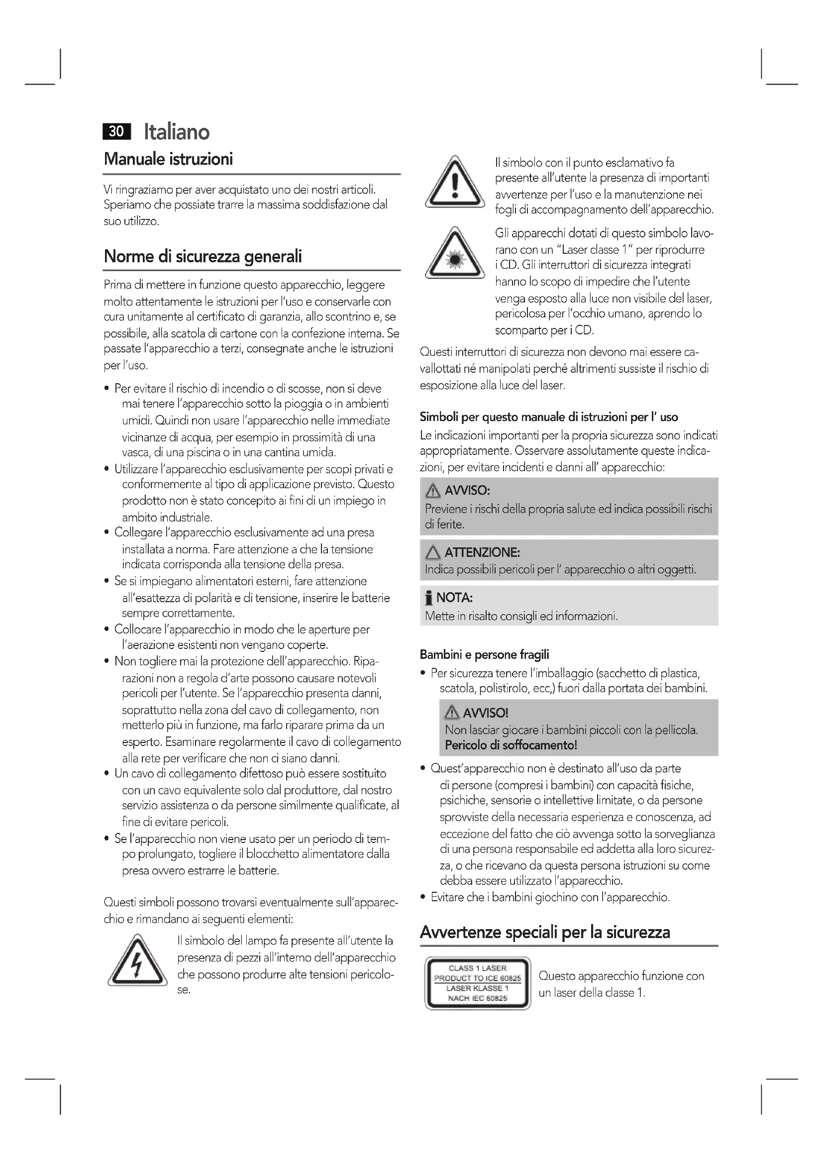 - Se l’apparecchio non viene usato per un periodo di tem- po prolungato, togliere il blocchetto alimentatore dalla presa ovvero estrarre le batterie. Questi simboli possono trovarsi eventualmente sull’apparec- chio e rimandano ai seguenti elementi: Il simbolo del lampo fa presente all’utente la presenza di pezzi all’interno dell’apparecchio che possono produrre alte tensioni pericolo- se. Il simbolo con il punto esclamativo fa presente all’utente la presenza di importanti avvertenze per l’uso e la manutenzione nei fogli di accompagnamento dell’apparecchio. Gli apparecchi dotati di questo simbolo lavo- rano con un “Laser classe 1” per riprodurre i CD. Gli interruttori di sicurezza integrati hanno lo scopo di impedire che l’utente venga esposto alla luce non visibile del laser, pericolosa per l’occhio umano, aprendo lo scomparto per i CD. Questi interruttori di sicurezza non devono mai essere ca- vallottati né manipolati perché altrimenti sussiste il rischio di esposizione alla luce del laser. Simboli per questo manuale di istruzioni per l’ uso Le indicazioni importanti per la propria sicurezza sono indicati appropriatamente. Osservare assolutamente queste indica- zioni, per evitare incidenti e danni all’ apparecchio: AVVISO: Previene i rischi della propria salute ed indica possibili rischi di ferite. ATTENZIONE: Indica possibili pericoli per l’ apparecchio o altri oggetti. NOTA: Mette in risalto consigli ed informazioni. Bambini e persone fragili