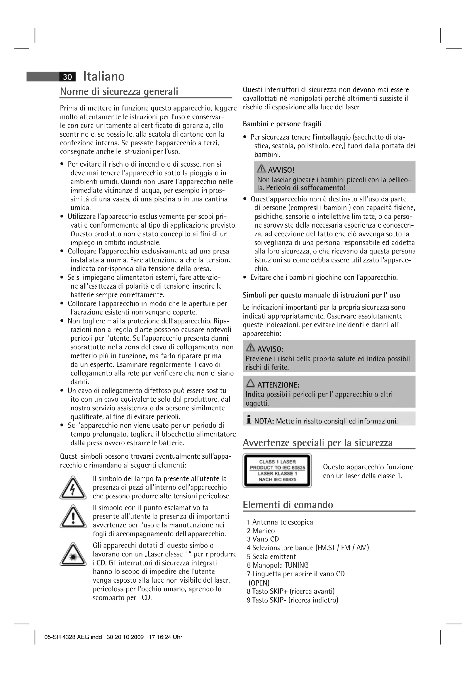 - Evitare che i bambini giochino con l’apparecchio. Simboli per questo manuale di istruzioni per l’ uso Le indicazioni importanti per la propria sicurezza sono indicati appropriatamente. Osservare assolutamente queste indicazioni, per evitare incidenti e danni all’ apparecchio: AVVISO: Previene i rischi della propria salute ed indica possibili rischi di ferite. ATTENZIONE: Indica possibili pericoli per l’ apparecchio o altri oggetti. NOTA: Mette in risalto consigli ed informazioni. Avvertenze speciali per la sicurezza Questo apparecchio funzione con un laser della classe 1. Elementi di comando 1 Antenna telescopica 2 Manico 3 Vano CD 4 Selezionatore bande (FM.ST / FM / AM) 5 Scala emittenti 6 Manopola TUNING 7 Linguetta per aprire il vano CD (OPEN) 8 Tasto SKIP+ (ricerca avanti) 9 Tasto SKIP- (ricerca indietro) 05-SR 4328 AEG.indd 30 20.10.2009 17:16:24 UhrItaliano