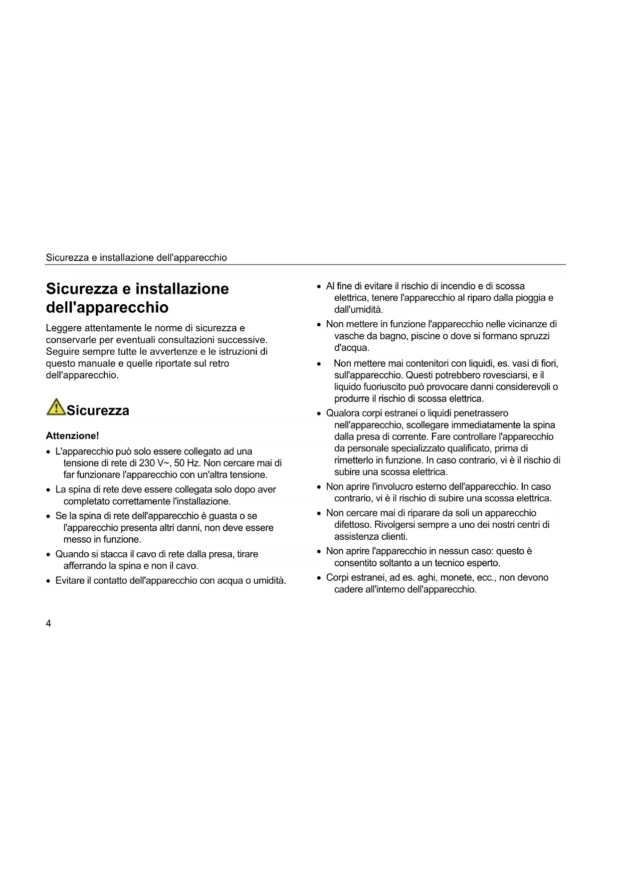 Sicurezza e installazione dell'apparecchio Leggere attentamente le norme di sicurezza e conservarle per eventuali consultazioni successive. Seguire sempre tutte le avvertenze e le istruzioni di questo manuale e quelle riportate sul retro dell'apparecchio. Sicurezza Attenzione!
