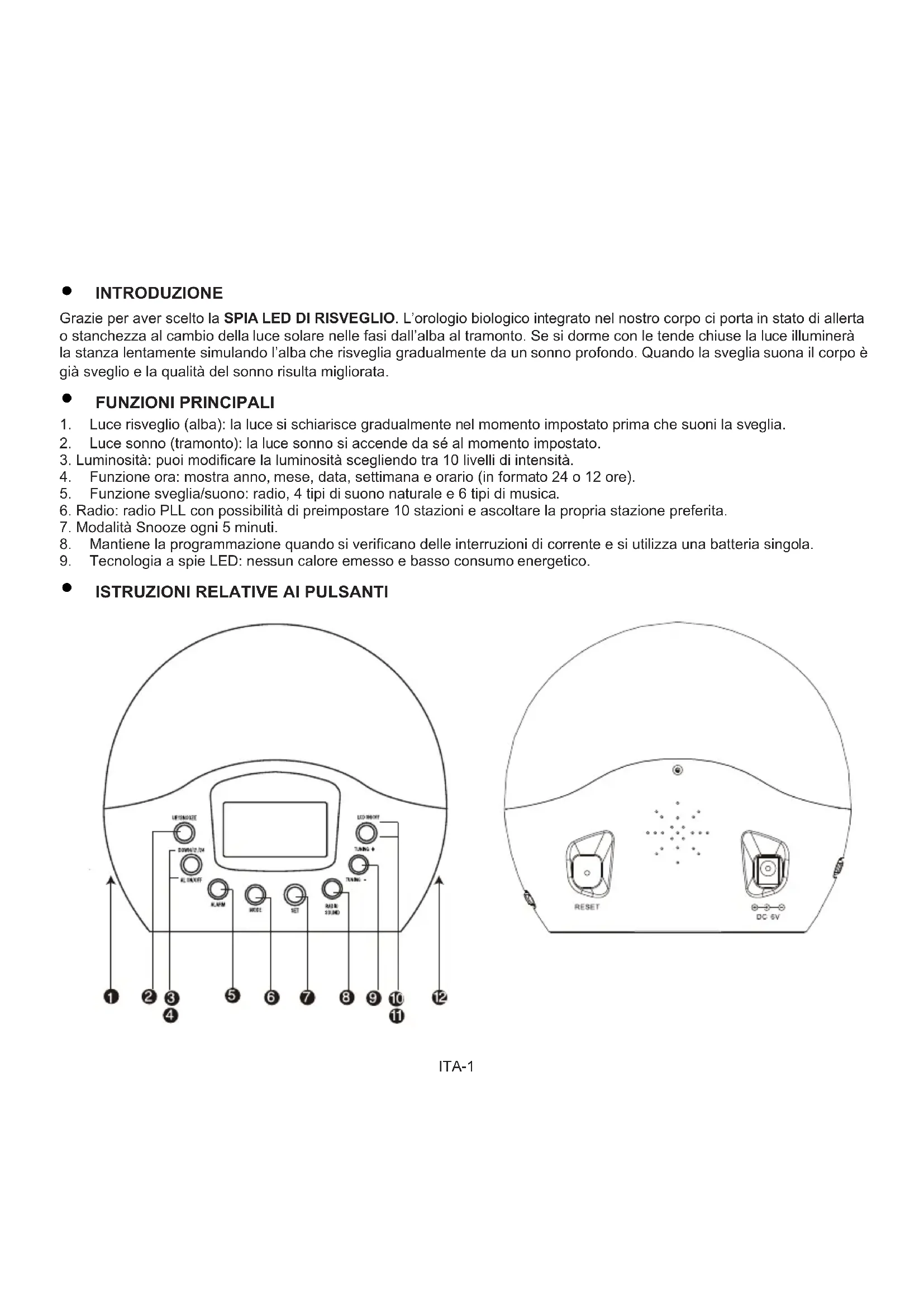 Grazie per aver scelto la SPIA LED DI RISVEGLIO. L'orologio biologico integrato nel nostro corpo ci porta in stato di allerta o stanchezza alchio della luce solare nelle fasi dall'alba al tramonto. Se si dorme con le tende chiuse la luce illuminera la stanza lentamente simulando l'alba che risveglia gradualmente da un sonno profondo. Quando la sveglia suona il corpo è già sveglio e la qualità del sonno risultata migliorata.