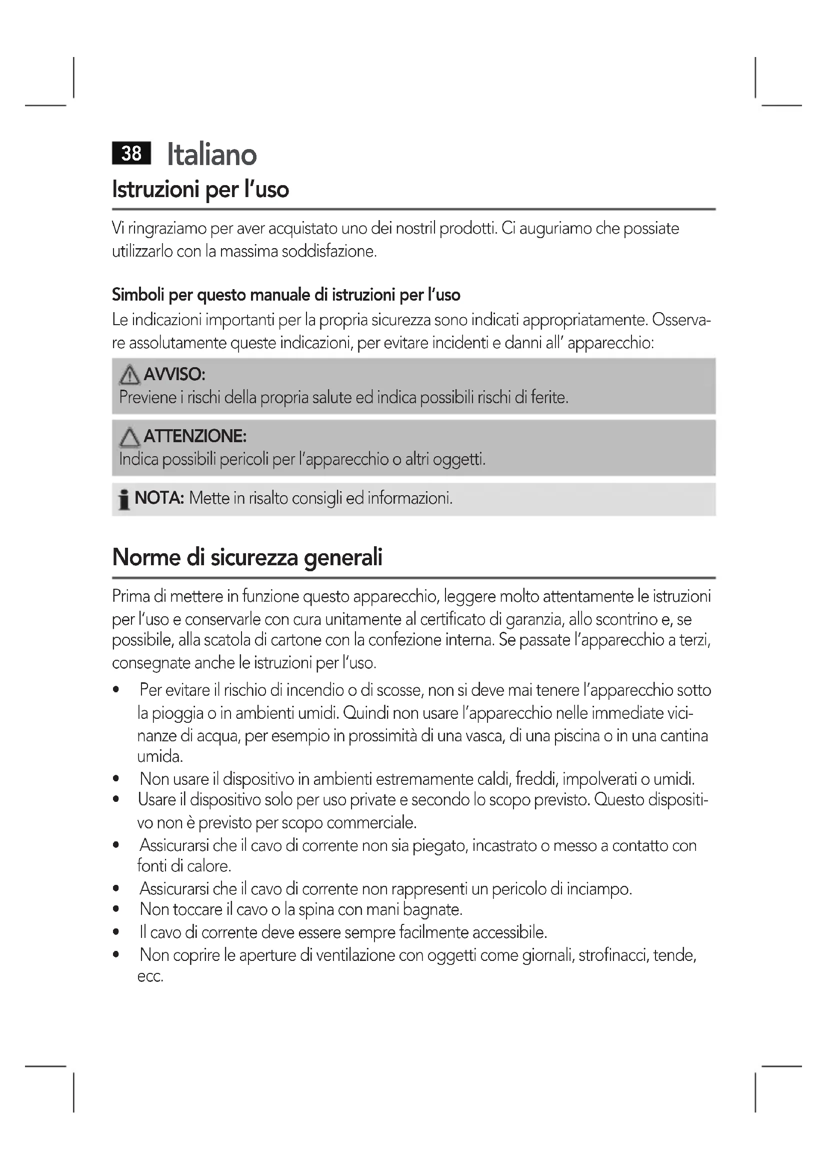 Istruzioni per l’uso Vi ringraziamo per aver acquistato uno dei nostril prodotti. Ci auguriamo che possiate utilizzarlo con la massima soddisfazione. Simboli per questo manuale di istruzioni per l’uso Le indicazioni importanti per la propria sicurezza sono indicati appropriatamente. Osserva- re assolutamente queste indicazioni, per evitare incidenti e danni all’ apparecchio: AVVISO: Previene i rischi della propria salute ed indica possibili rischi di ferite. ATTENZIONE: Indica possibili pericoli per l’apparecchio o altri oggetti. NOTA: Mette in risalto consigli ed informazioni. Norme di sicurezza generali Prima di mettere in funzione questo apparecchio, leggere molto attentamente le istruzioni per l’uso e conservarle con cura unitamente al certificato di garanzia, allo scontrino e, se possibile,allascatoladicartoneconlaconfezioneinterna.Sepassatel‘apparecchioaterzi, consegnateancheleistruzioniperl‘uso.