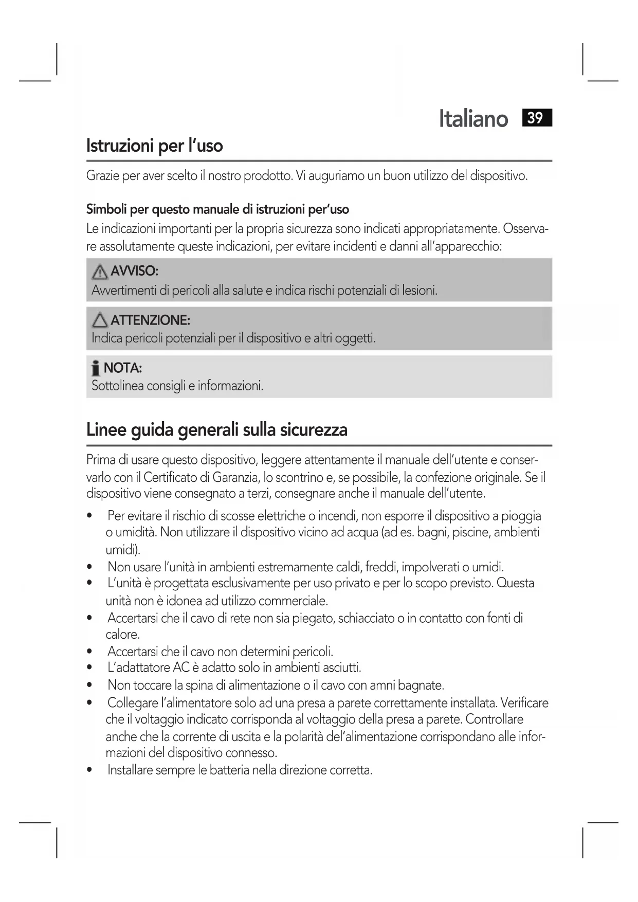 Istruzioni per l’uso Grazie per aver scelto il nostro prodotto. Vi auguriamo un buon utilizzo del dispositivo. Simboli per questo manuale di istruzioni per’uso Le indicazioni importanti per la propria sicurezza sono indicati appropriatamente. Osserva- re assolutamente queste indicazioni, per evitare incidenti e danni all’apparecchio: AVVISO: Avvertimenti di pericoli alla salute e indica rischi potenziali di lesioni. ATTENZIONE: Indica pericoli potenziali per il dispositivo e altri oggetti. NOTA: Sottolinea consigli e informazioni. Linee guida generali sulla sicurezza Prima di usare questo dispositivo, leggere attentamente il manuale dell’utente e conser- varlo con il Certificato di Garanzia, lo scontrino e, se possibile, la confezione originale. Se il dispositivo viene consegnato a terzi, consegnare anche il manuale dell’utente.